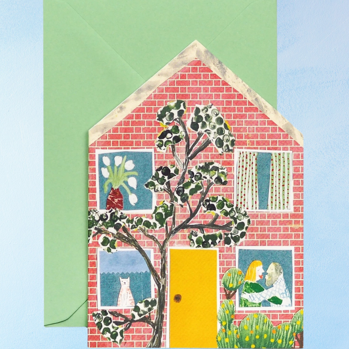 A greeting card featuring perfect country cottage, with a cat in the yard and flowers around the front door. This is a house shaped card: great for people moving in to a new home or for that friend who craves a simpler life.