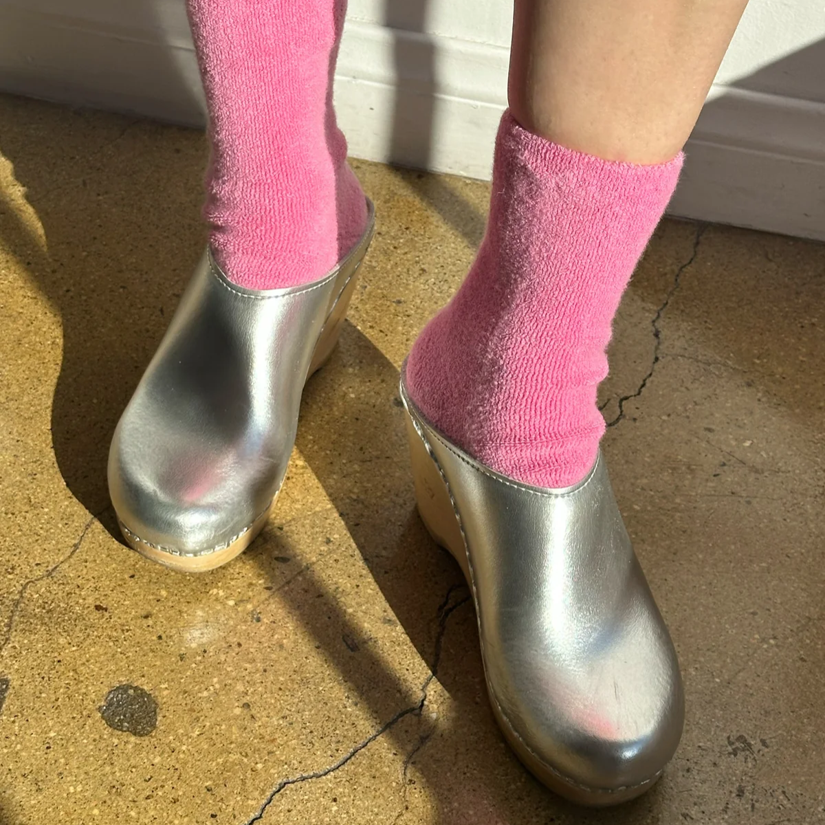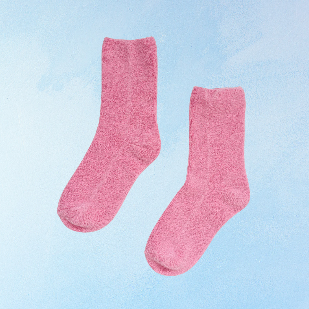 Like walking on clouds! These are hands down the comfiest and cutest socks to wear all year long. Made from a fluffy, terry cotton blend yarn that is breathable and unique. While the exterior is fluffy, the interior is smooth and airy. Pair them with your favourite clogs or slides and enjoy the extra cushion.