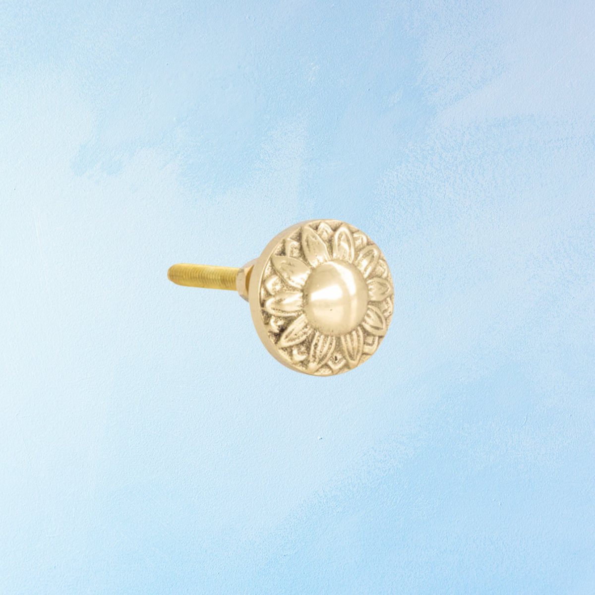 Handcrafted by skilled artisans from recycled brass, these furniture knobs feature a double layered sunflower design.
