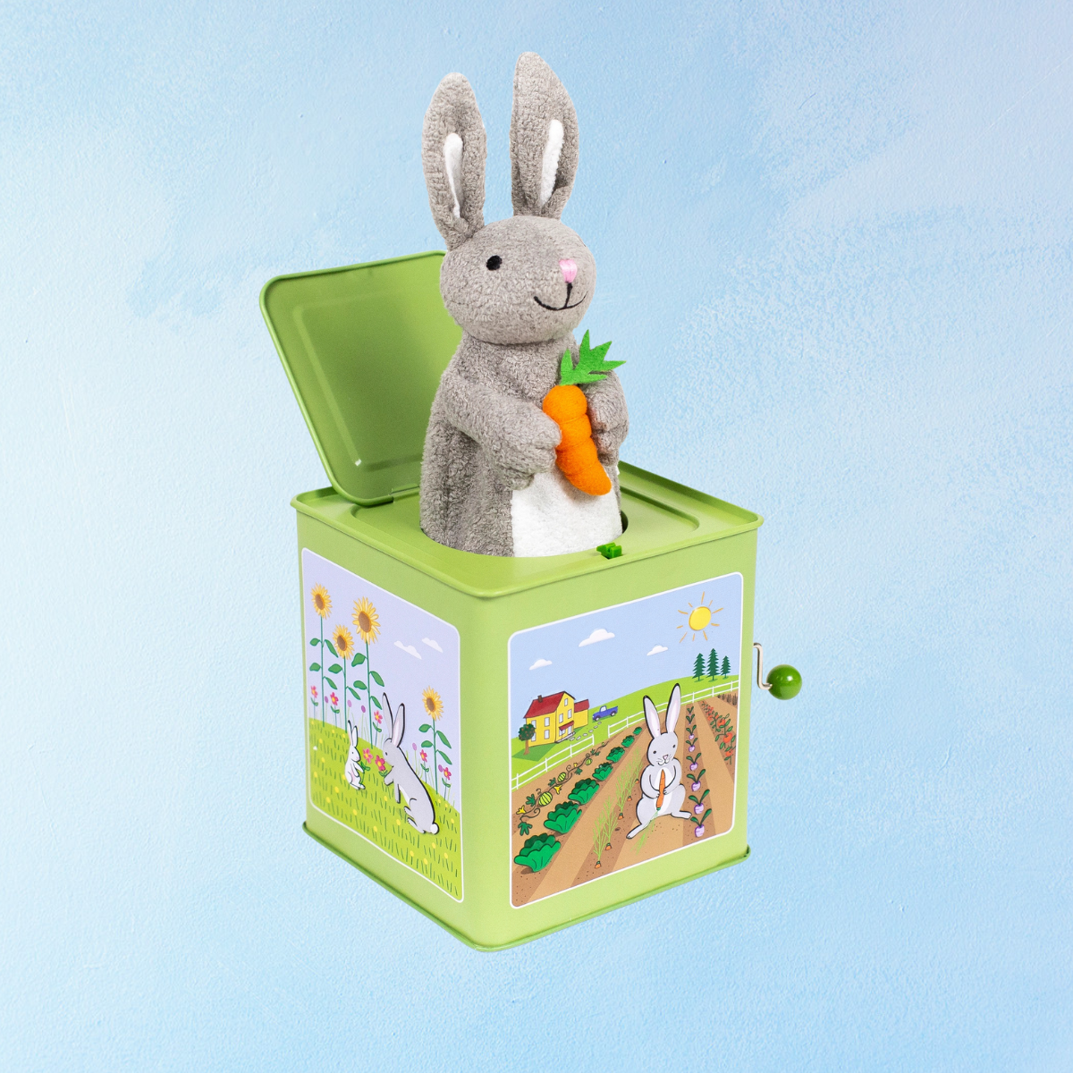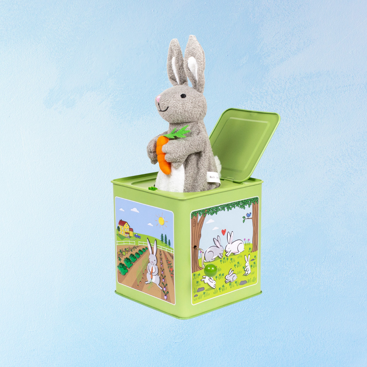 Introduce old traditions to new little ones with a bunny themed jack-in-a-box toy. Wind it up and wait for a cuddly plush character to spring forth to the tune of “Here Comes Peter Cottontail”.