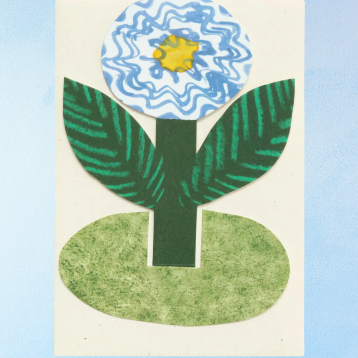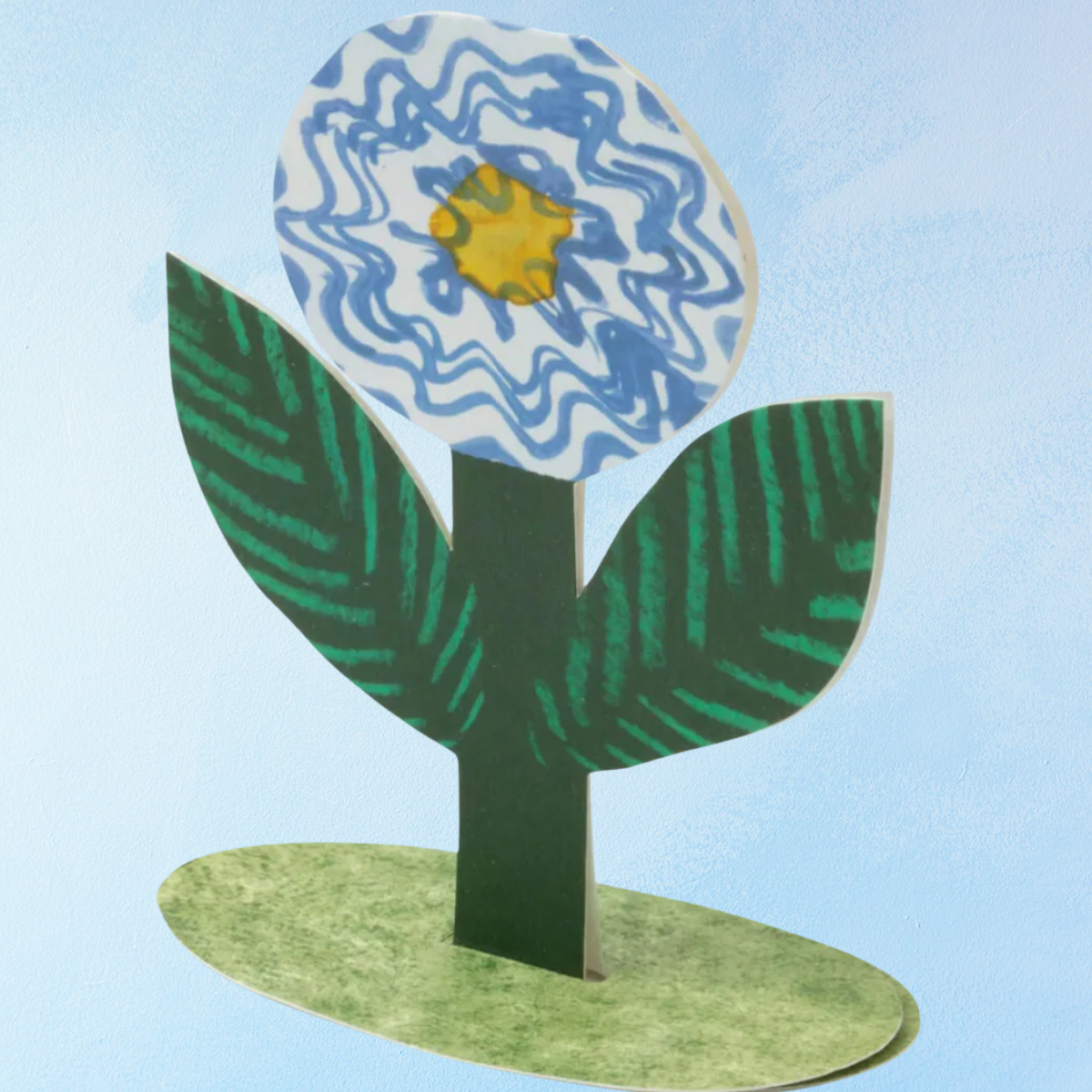 A cute blue flower to brighten your day! This beautiful blue flower card folds out to become free standing on its own grassy-looking base. Send someone special (or yourself) a flower that will last!