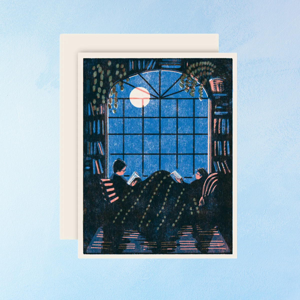 Cozy letterpress printed greeting card with two people reading! It's simply adorable!