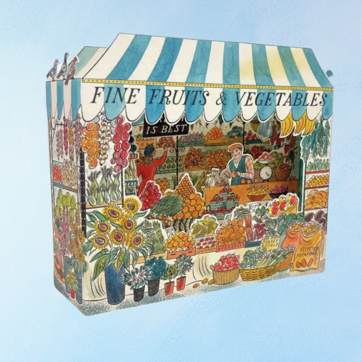 This greeting card is so much more than a message, it's a presentable piece of 3D art! Featuring a multi-layered scene with fresh flowers, produce, and friendly merchant.