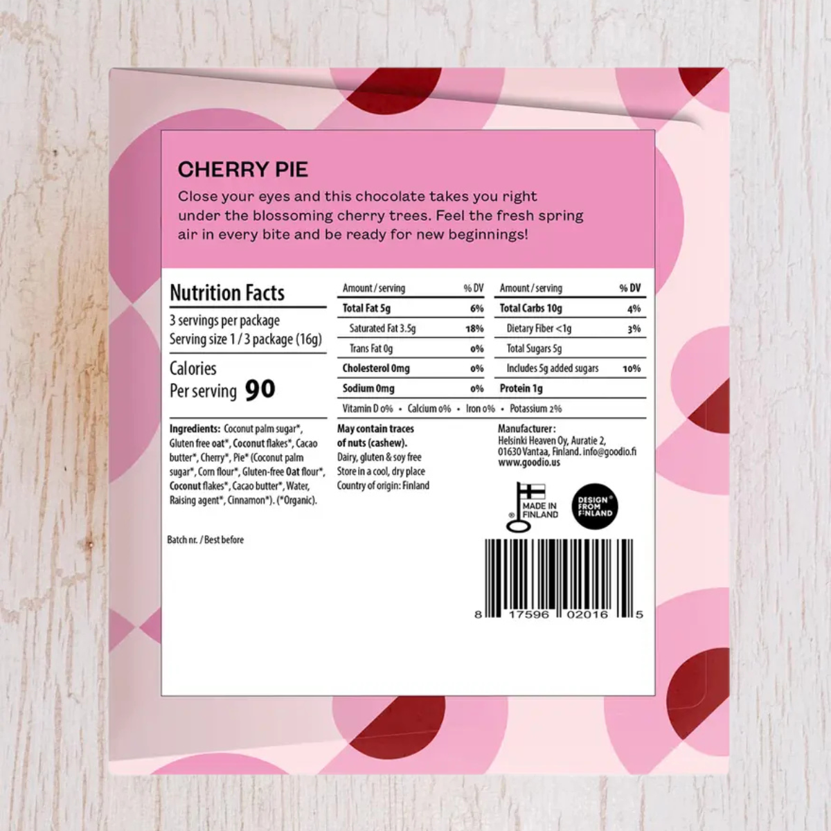 Contains: Coconut palm sugar*, Gluten free oat*, Coconut flakes*, Cacao butter*, Cherry*, Pie* (Coconut palm sugar*, Corn flour*, Gluten free oat flour*, Coconut flakes*, Cacao butter*, Water, Raising agent*, Cinnamon*). (*Organic).