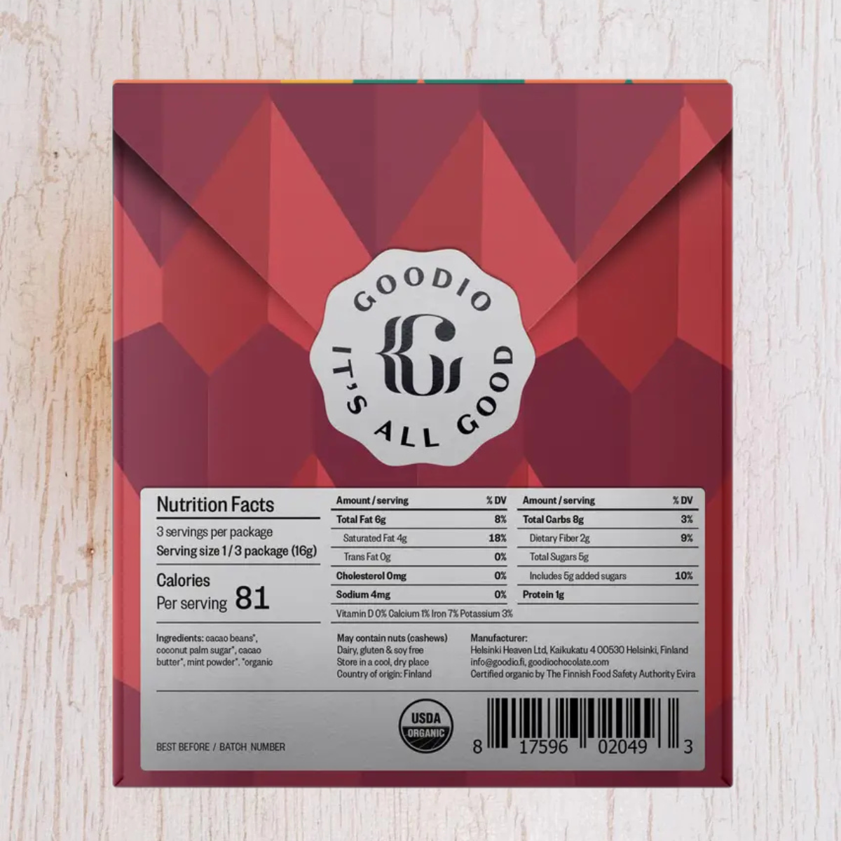 This bar is proudly handmade with love in Finland - the happiest country in the world by Goodio Chocolate Artists.