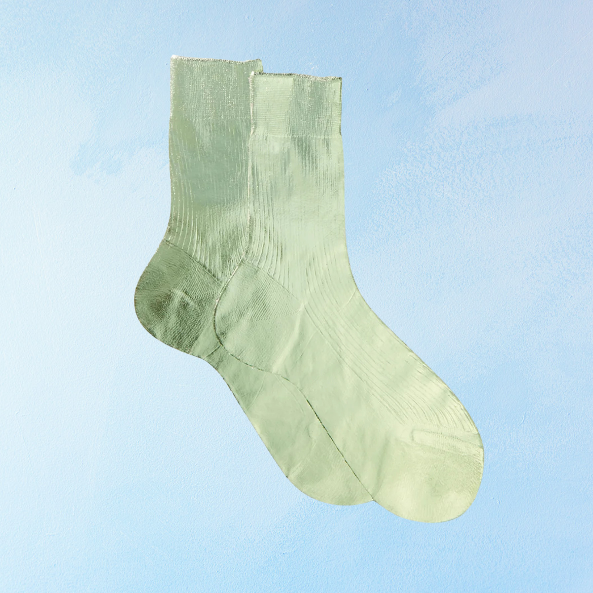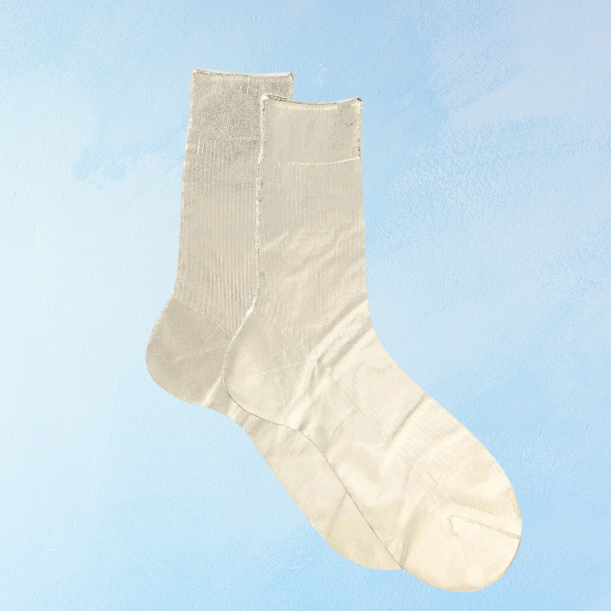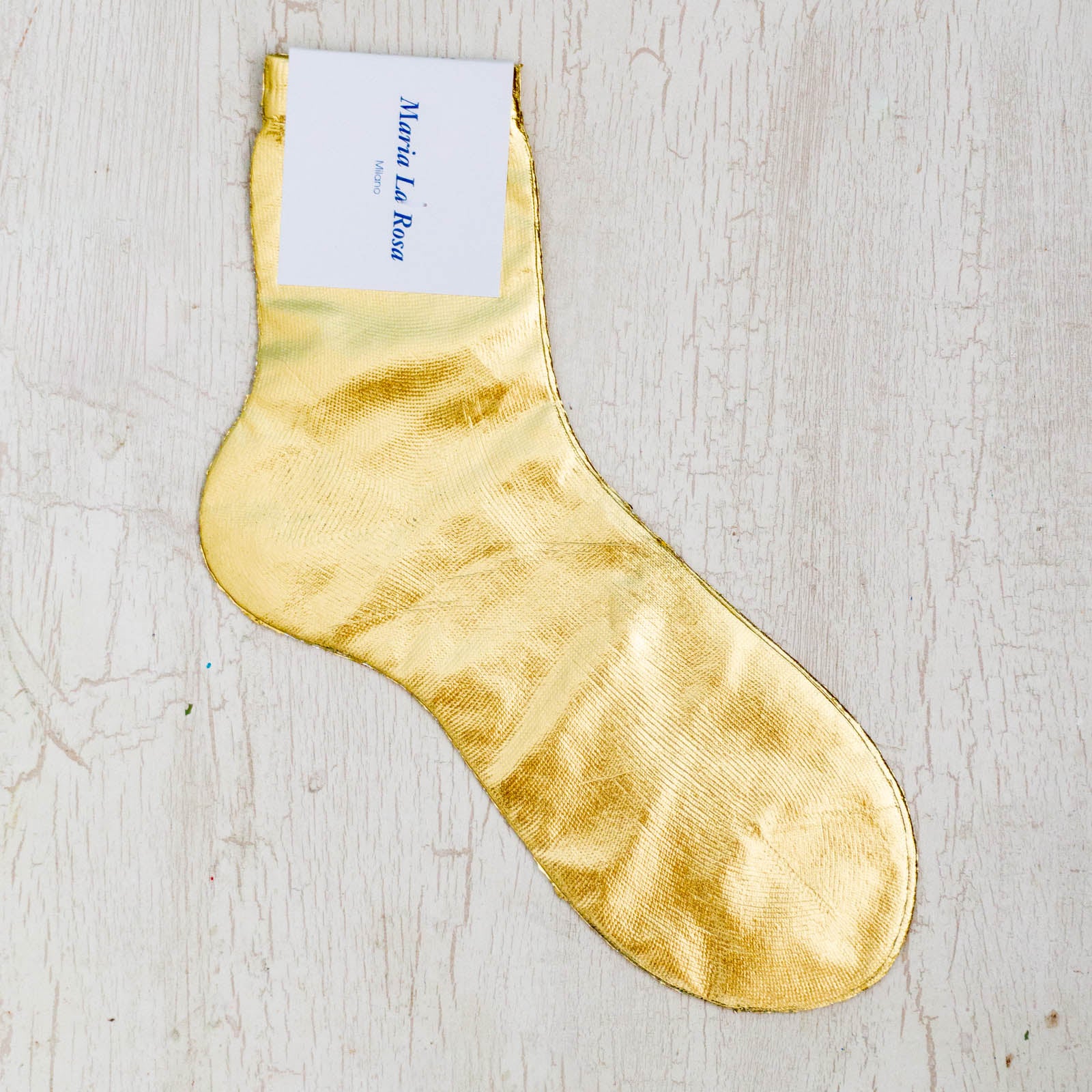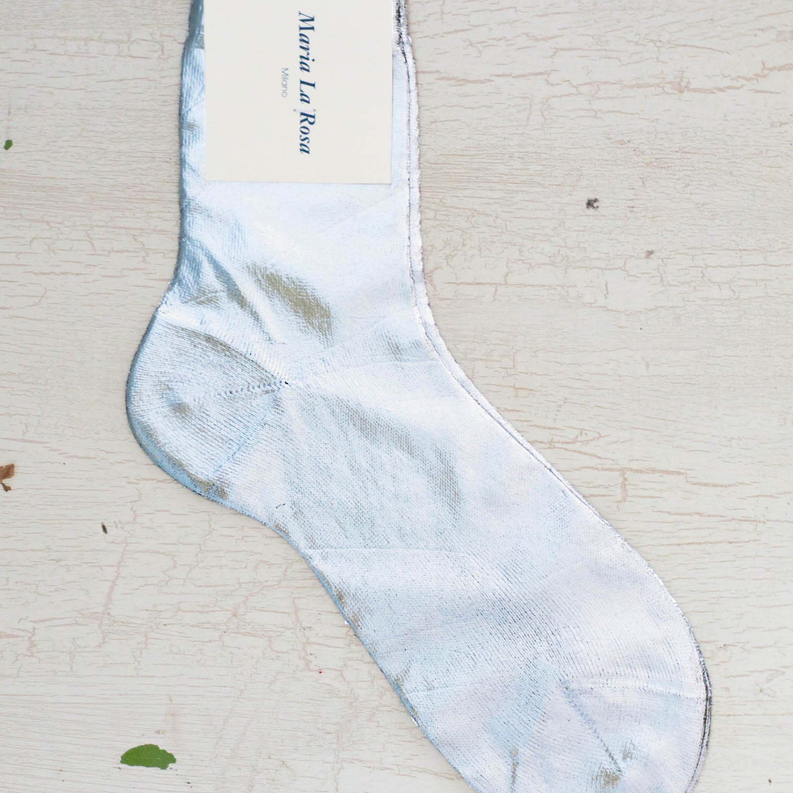 Women's laminated socks, made with precious silk yarn, ideal for all seasons. The material with which they are made, in fact, despite its thinness, is extraordinarily insulating, making it very cool in summer and warm in winter. The sock was subsequently covered with a metallic finish, which, after multiple washes, tends to disappear, letting the brilliance of the underlying silk emerge.