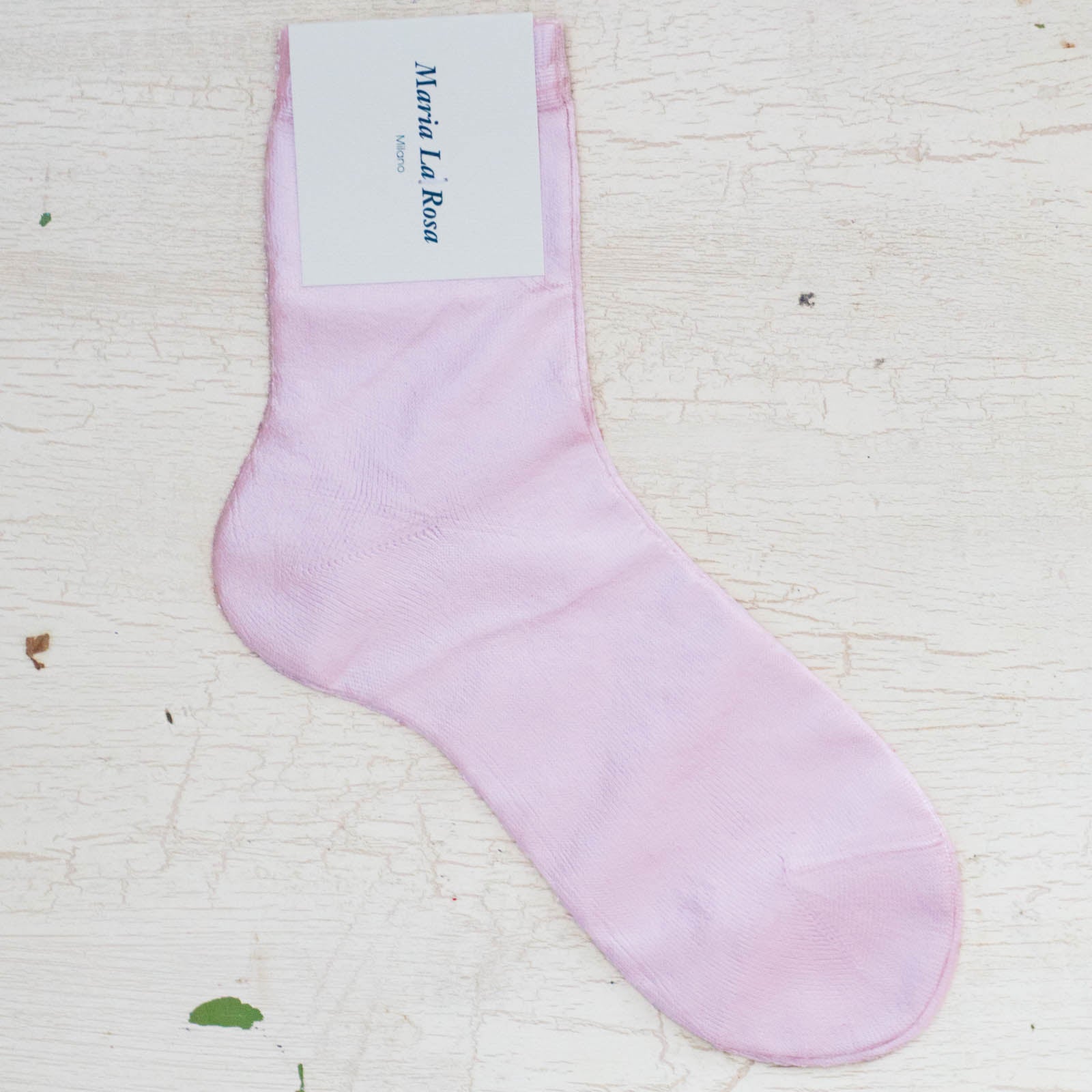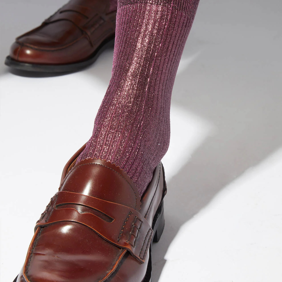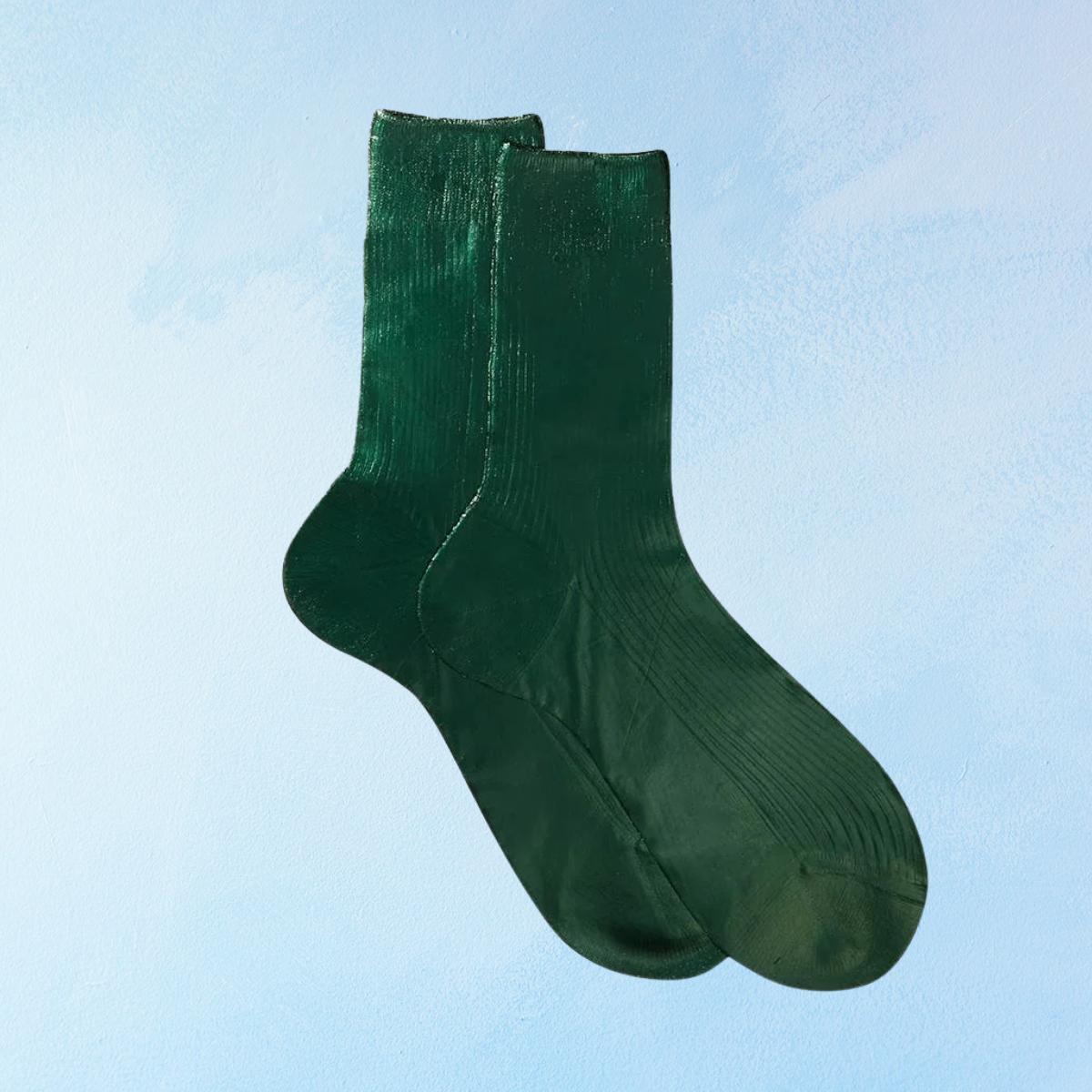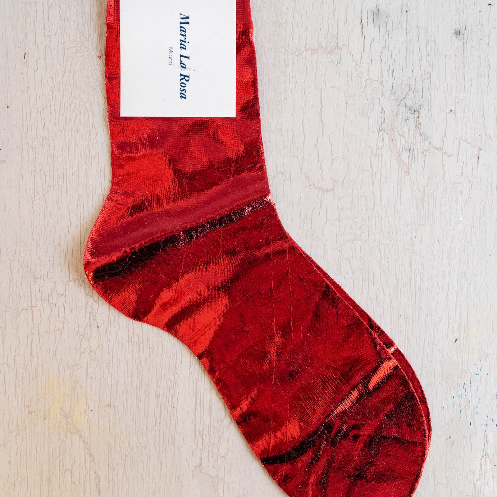 Women's laminated socks, made with precious silk yarn, ideal for all seasons. The material with which they are made, in fact, despite its thinness, is extraordinarily insulating, making it very cool in summer and warm in winter. The sock was subsequently covered with a metallic finish, which, after multiple washes, tends to disappear, letting the brilliance of the underlying silk emerge.