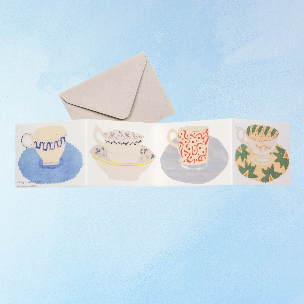Greeting card featuring four beautiful sets of tea cups and saucers, based on paintings and objects from Kettles Yard house, Cambridge. Unfolds to reveal!