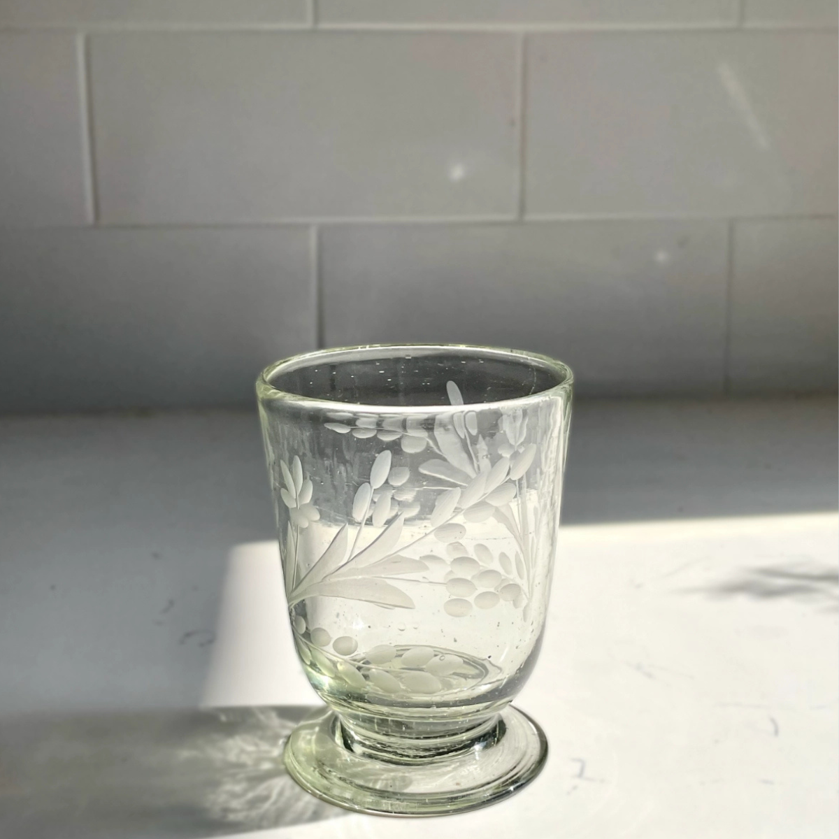 The prettiest handblown and hand-etched footed wine glasses.