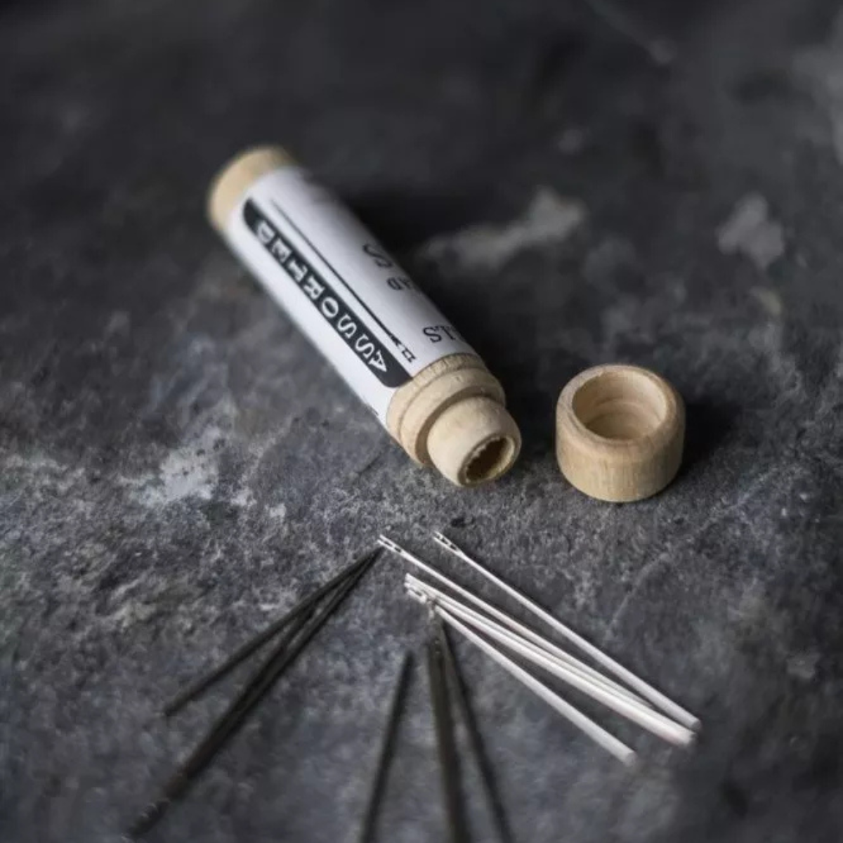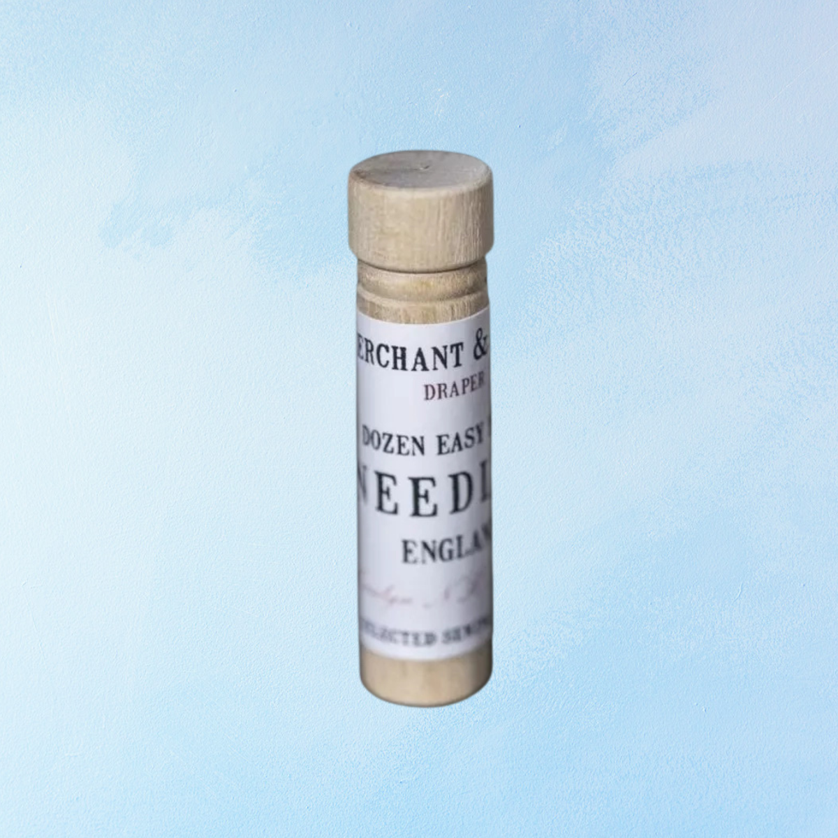 12 assorted size easy thread needles in a handy little wooden case that fits in any bag or pocket.