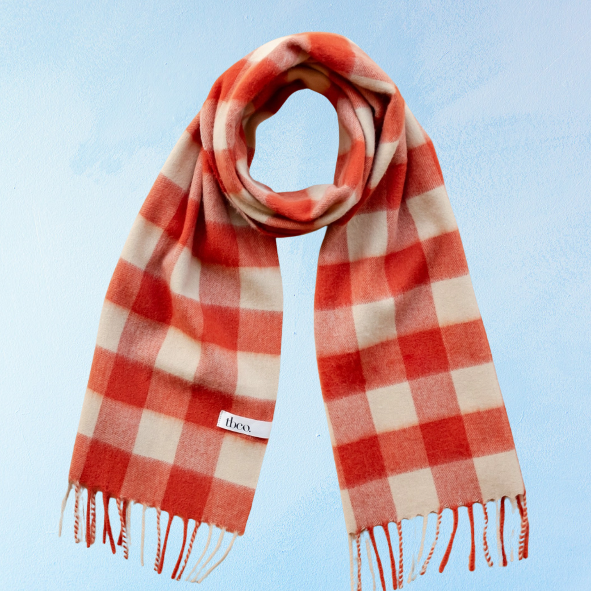 Elevate your outfit with this fringed check TBCo scarf that features an orange and cream gingham pattern. It's woven from sustainable soft and thermo-regulating lambswool for optimised comfort and warmth.