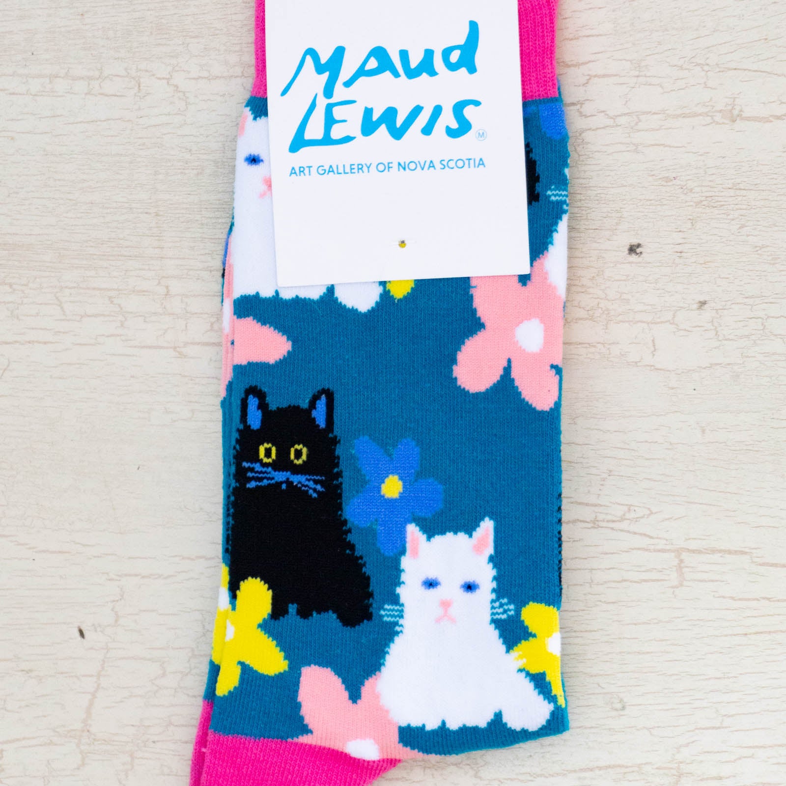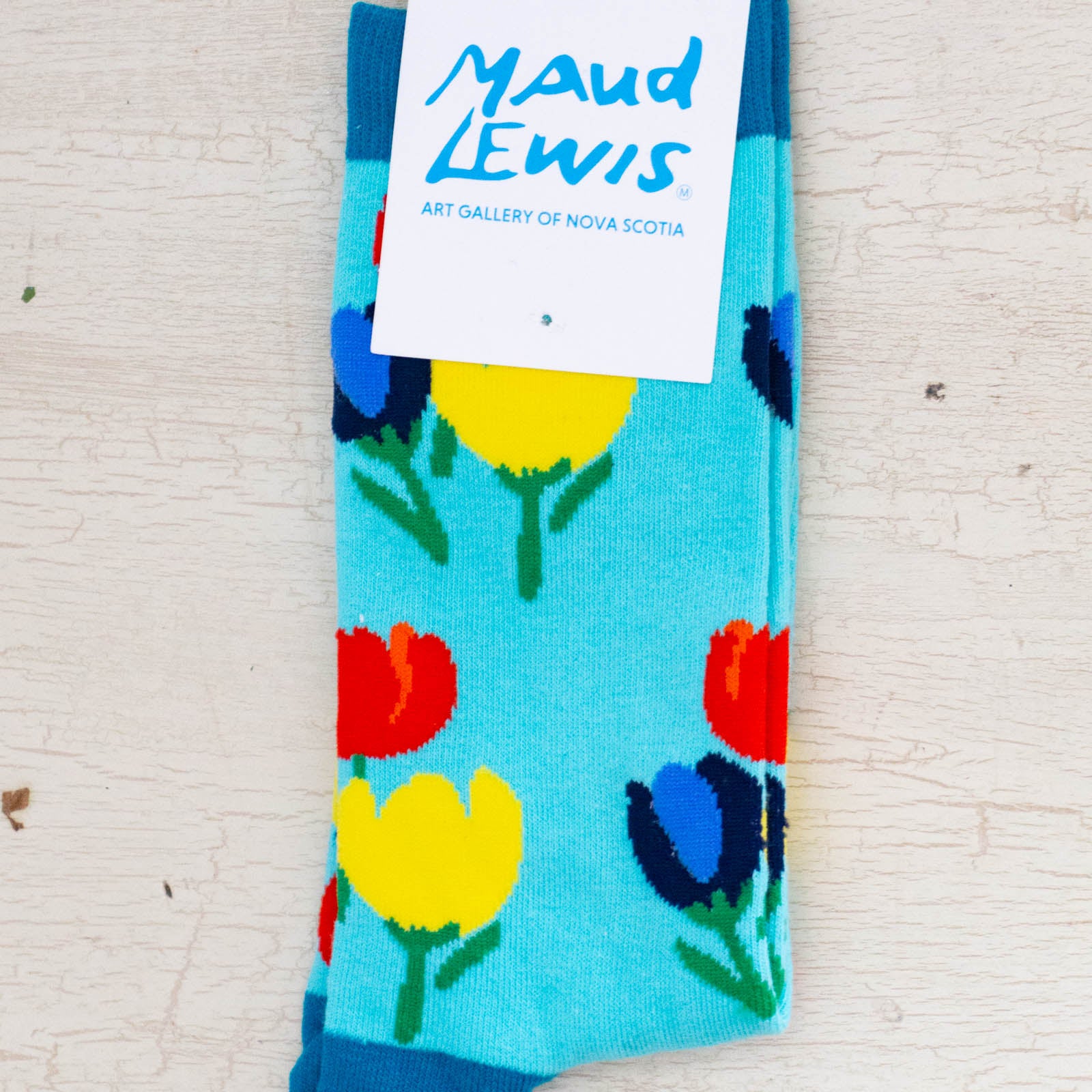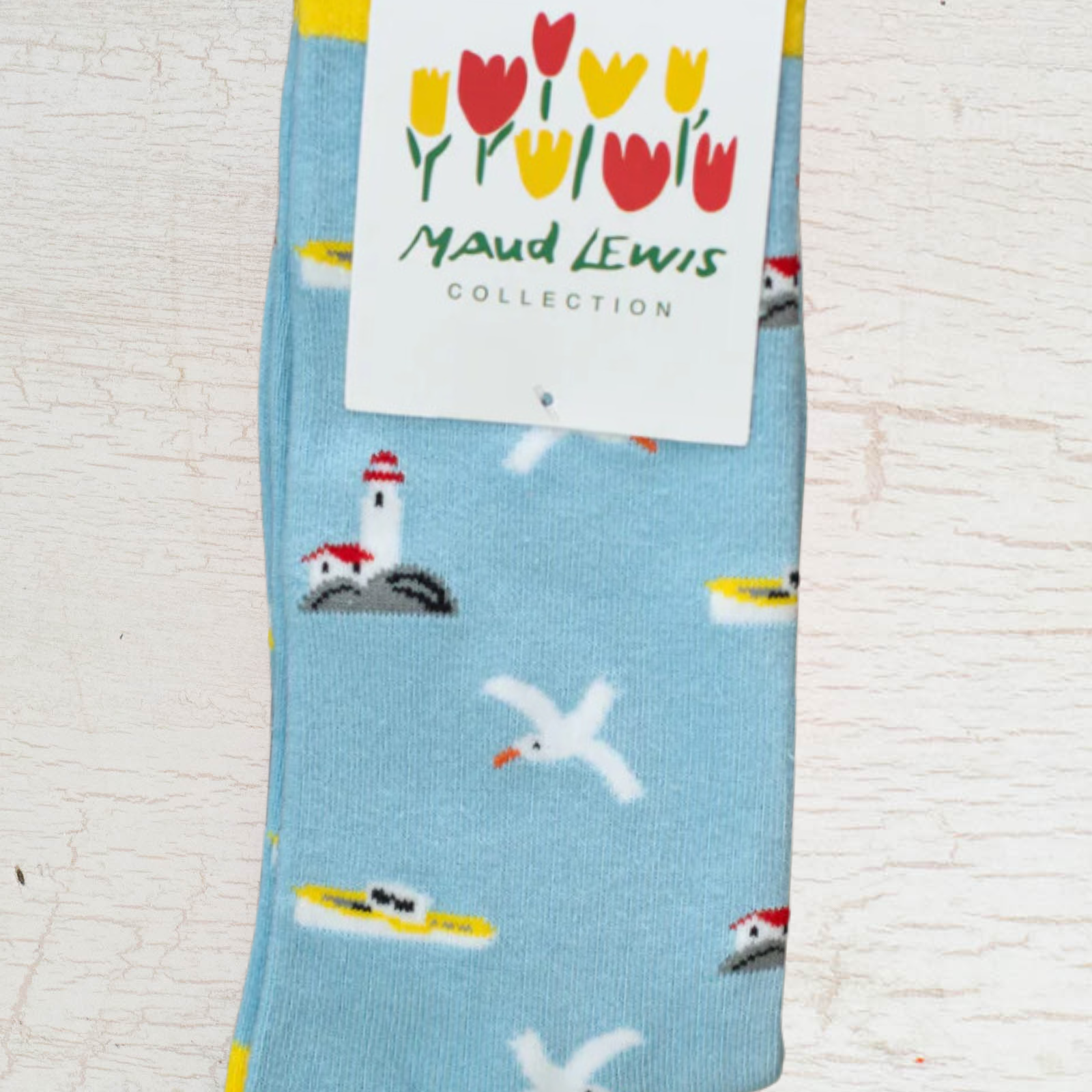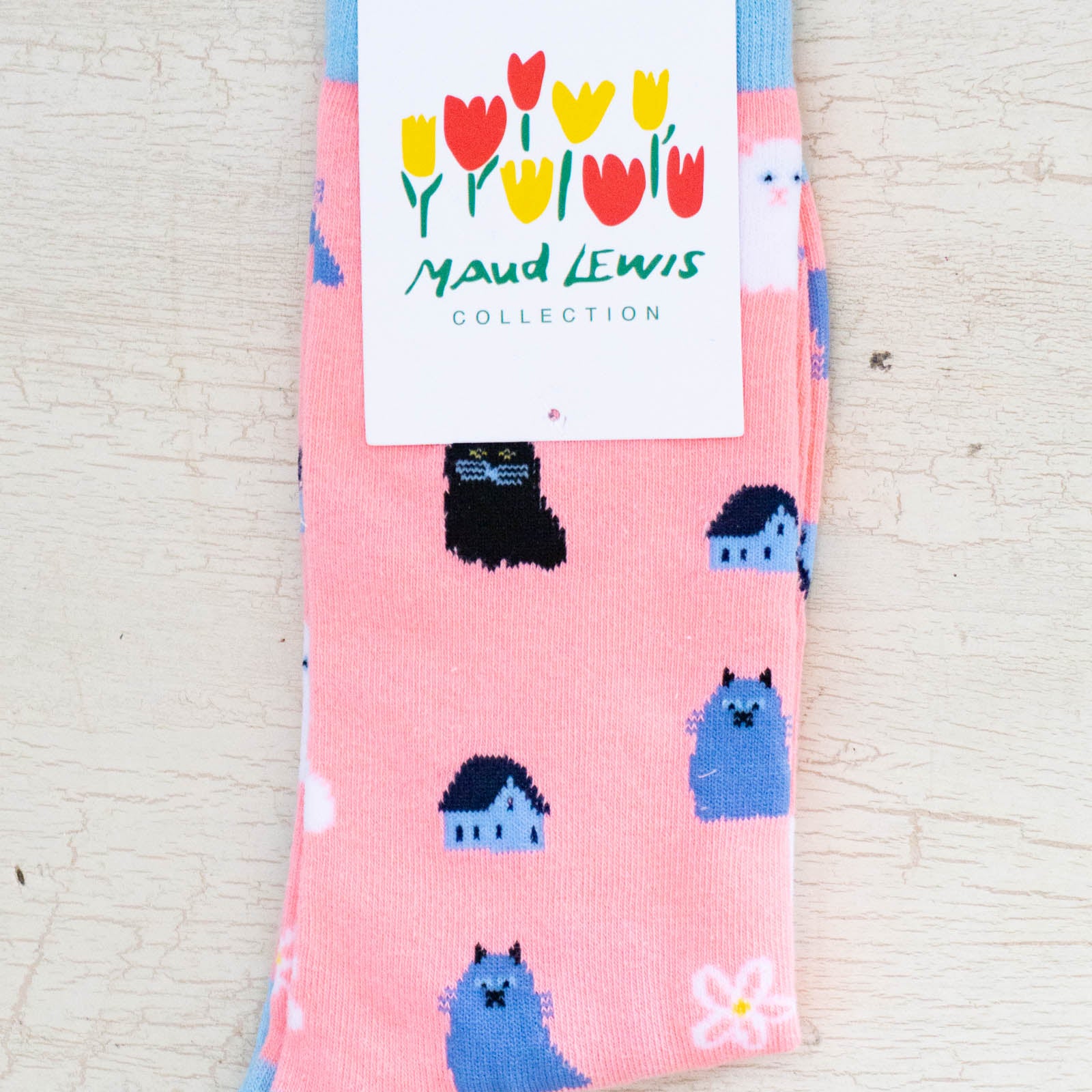 Sweet socks featuring beloved motifs from the work of Canadian artist Maud Lewis.