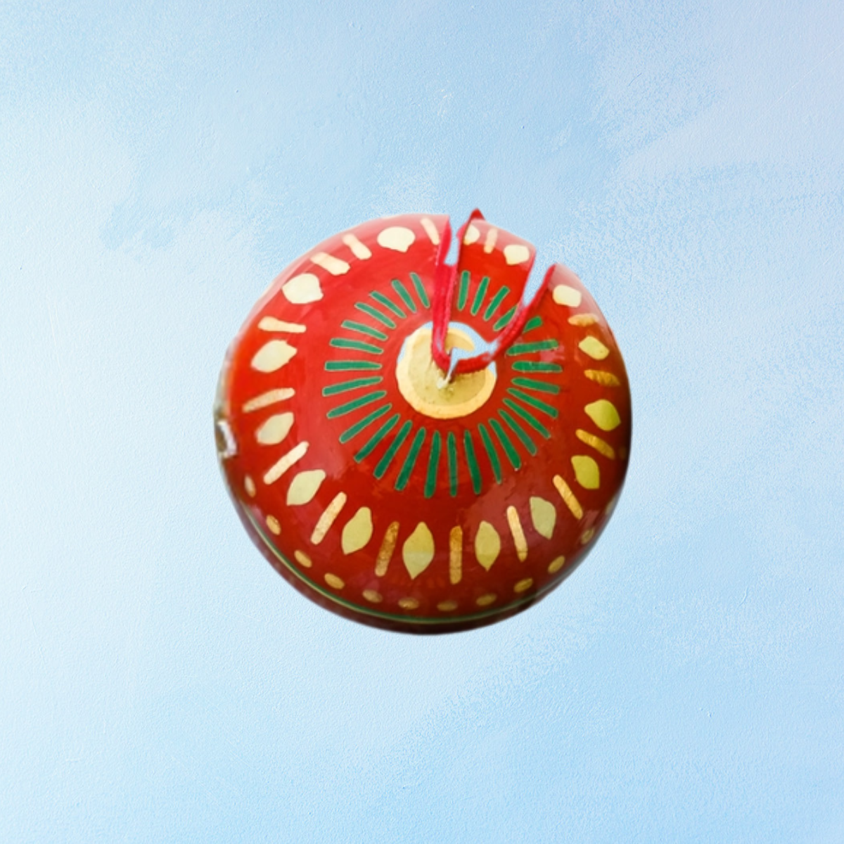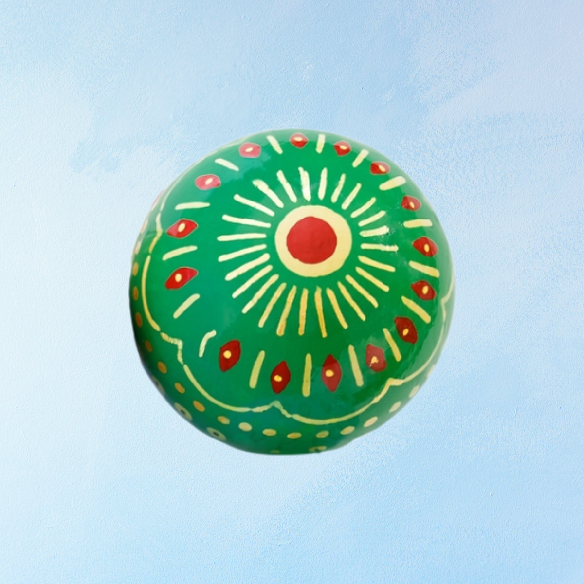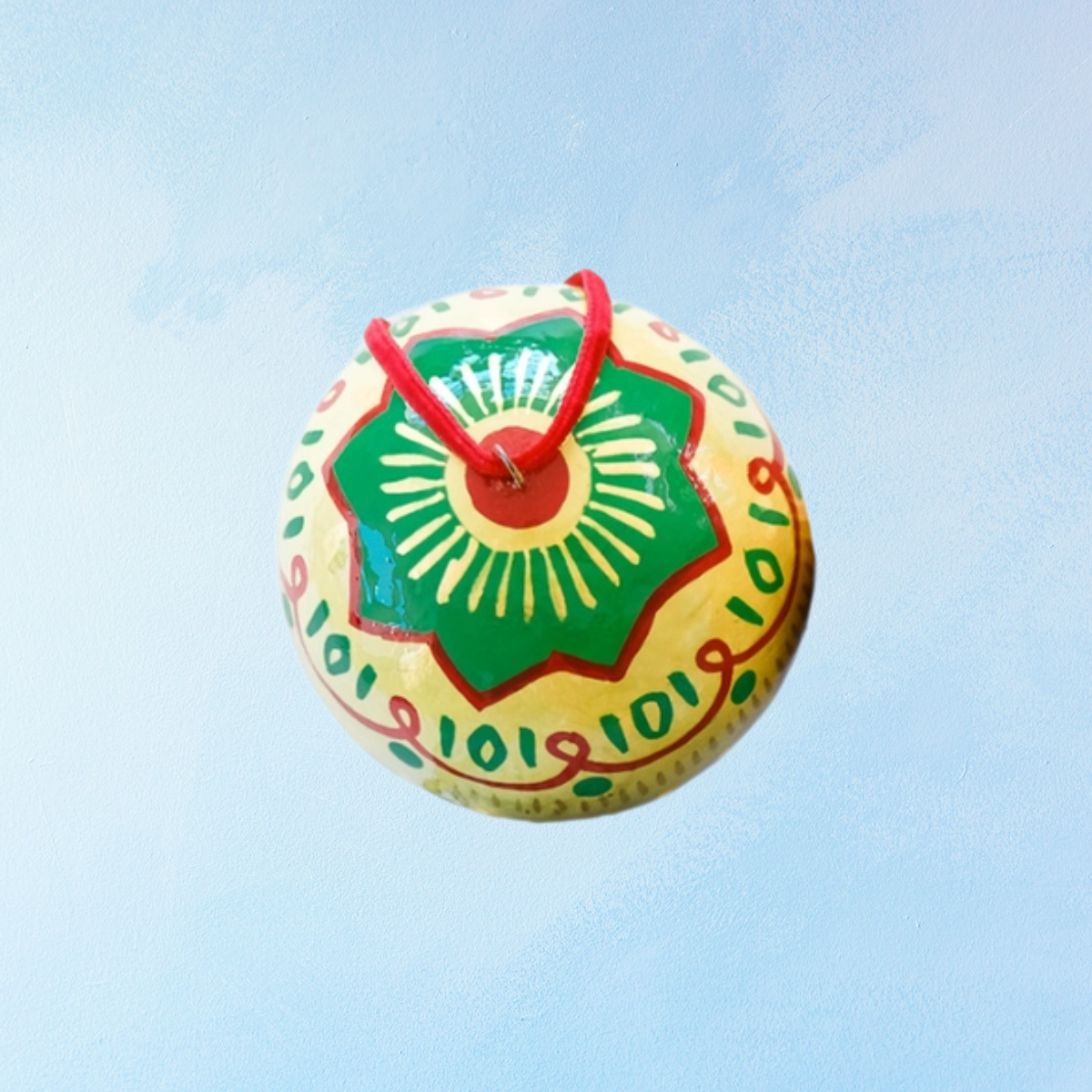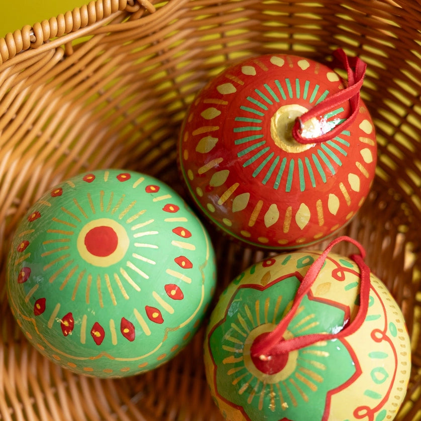 These beautiful baubles are all made from papier mâché recycled paper, hand-painted with intricate, colourful designs, and have a soft velvet thread hanging loop. Includes one of each style.
