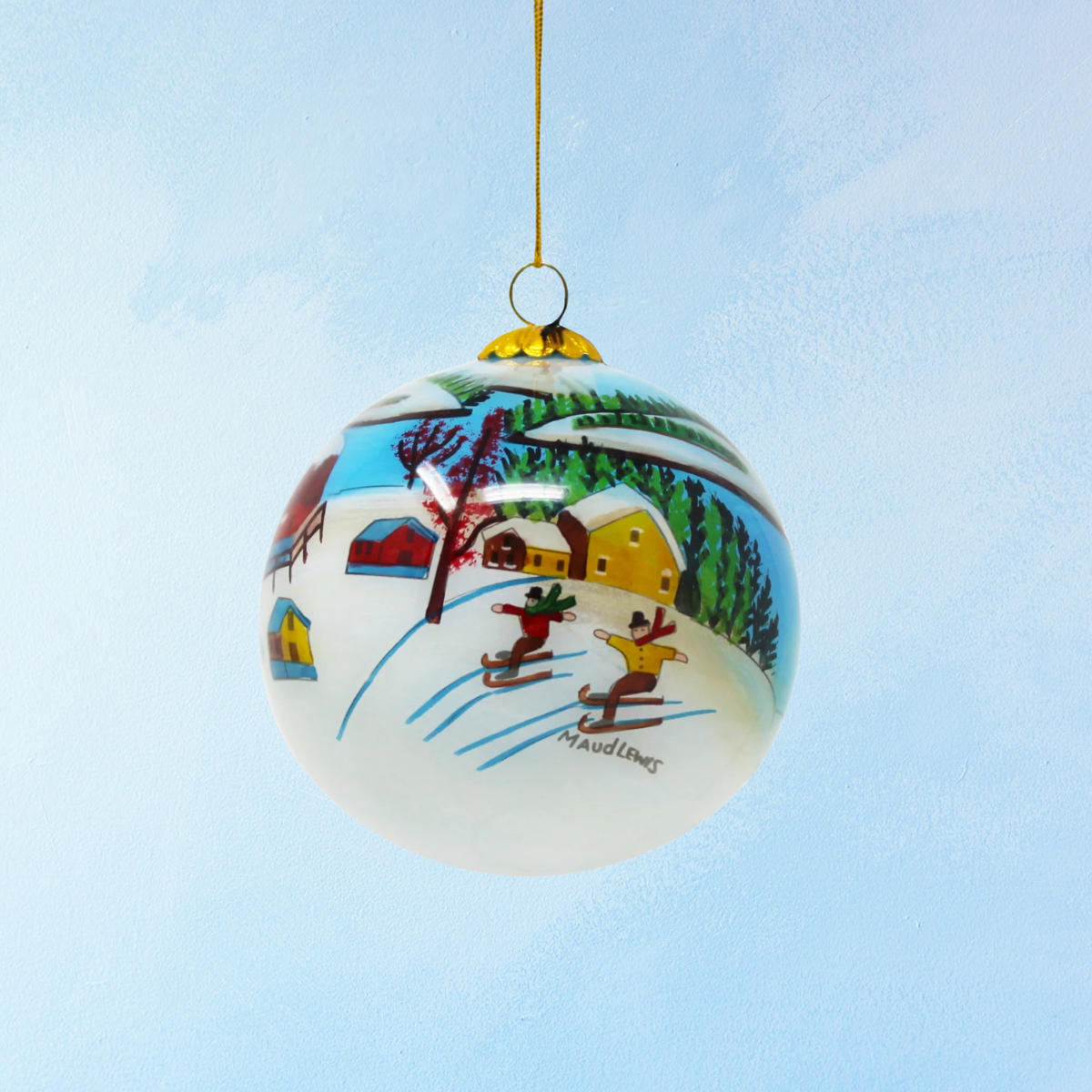 These exquisite glass ornaments are individually hand-painted reproductions of Maud Lewis's painting Children Skiing. They are sure to stand out with their red ribbon loop for hanging. Each ornament comes in a red, satin-lined gift box with toggle closure, and a tag that includes an artist bio of Maud.