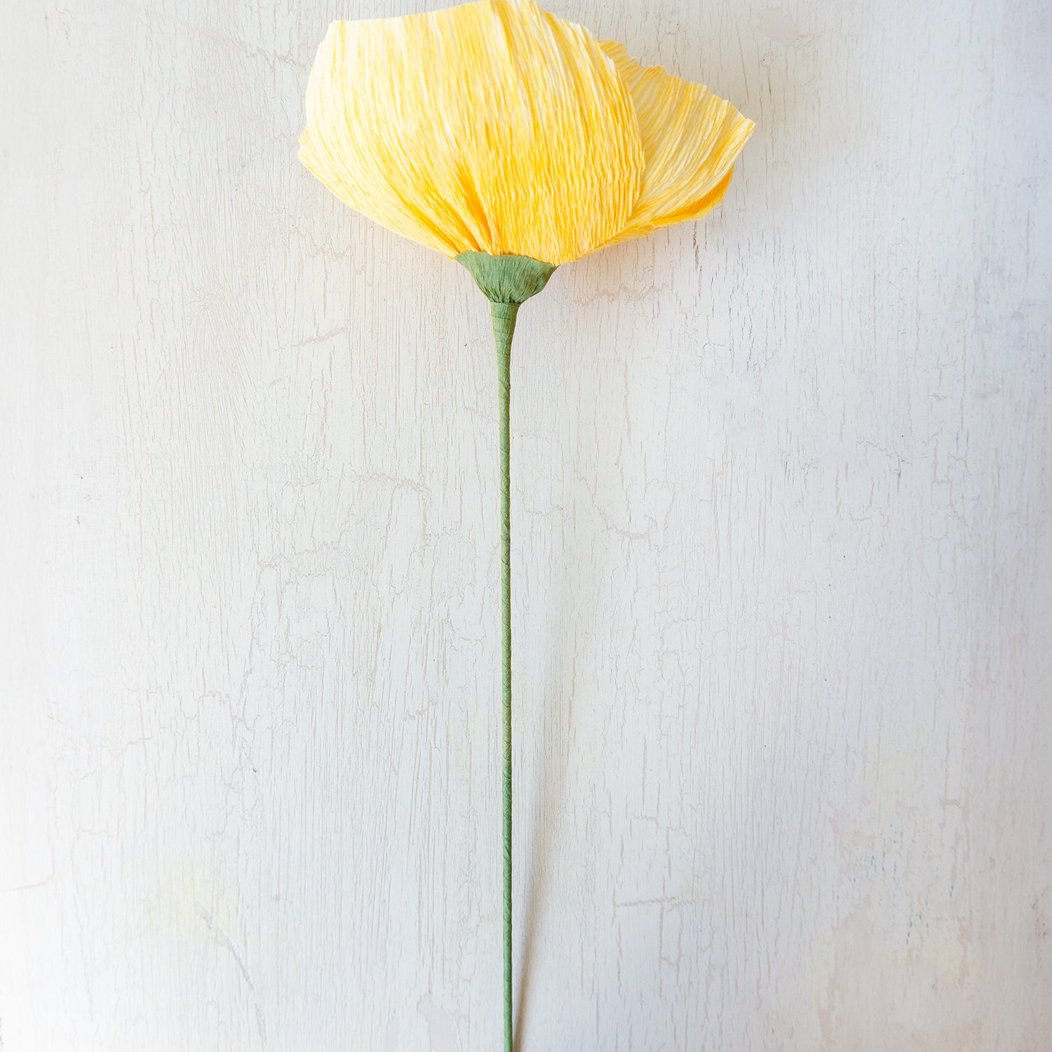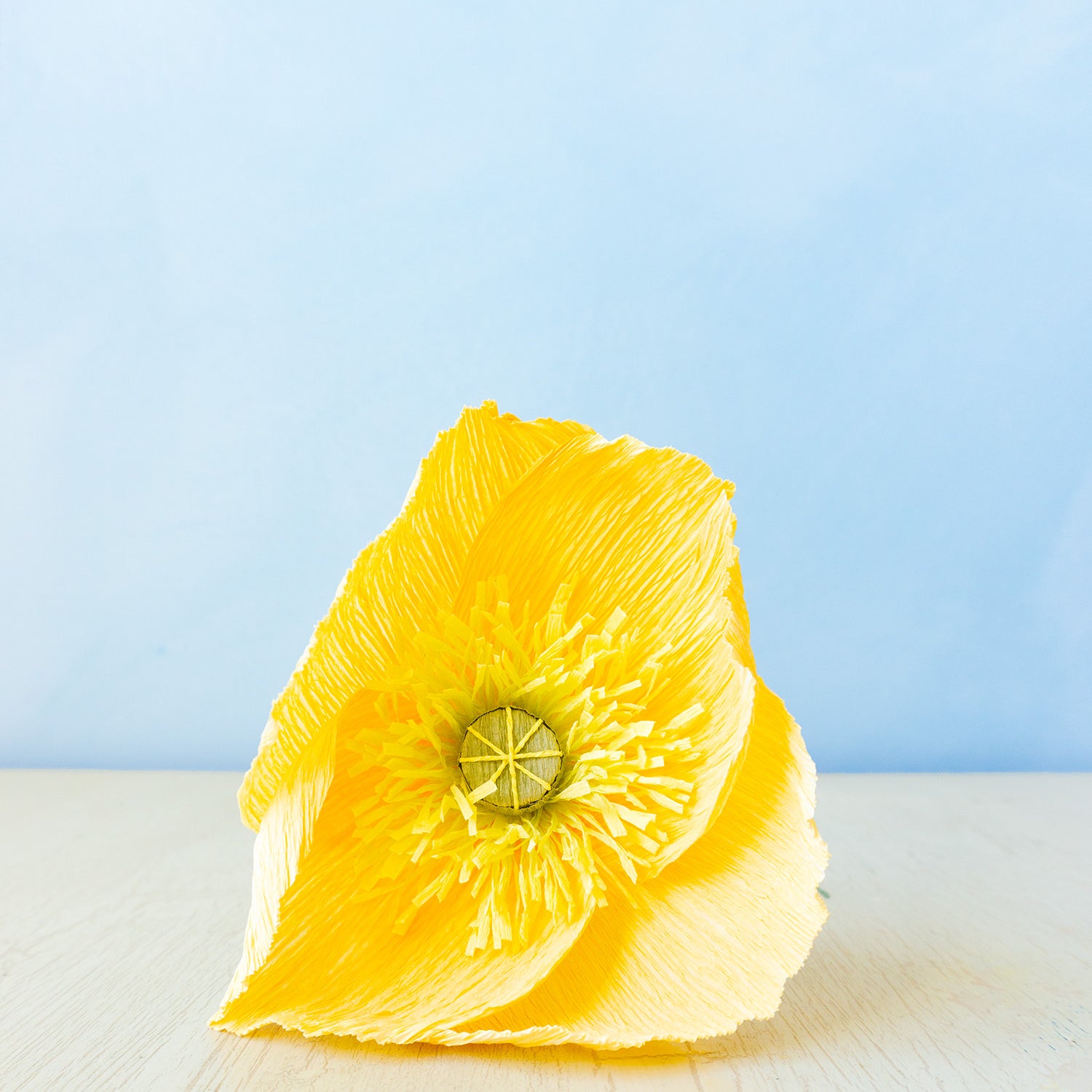 It may look shy, but this bold yellow poppy is no shrinking violet (literally and figuratively). Handmade in Ukraine from Italian crepe paper.