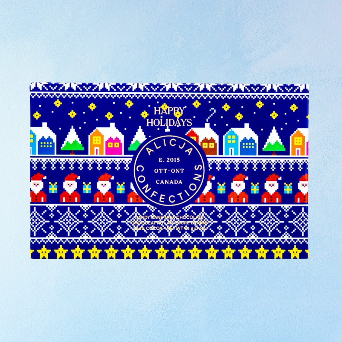 This classic milk chocolate bar has bits of crushed peppermint throughout and comes packaged in a festive sleeve and features a built in post-card on the back. Just add a message and your stamp to share a bit of joy with someone you love (or keep it for yourself, we don't judge).