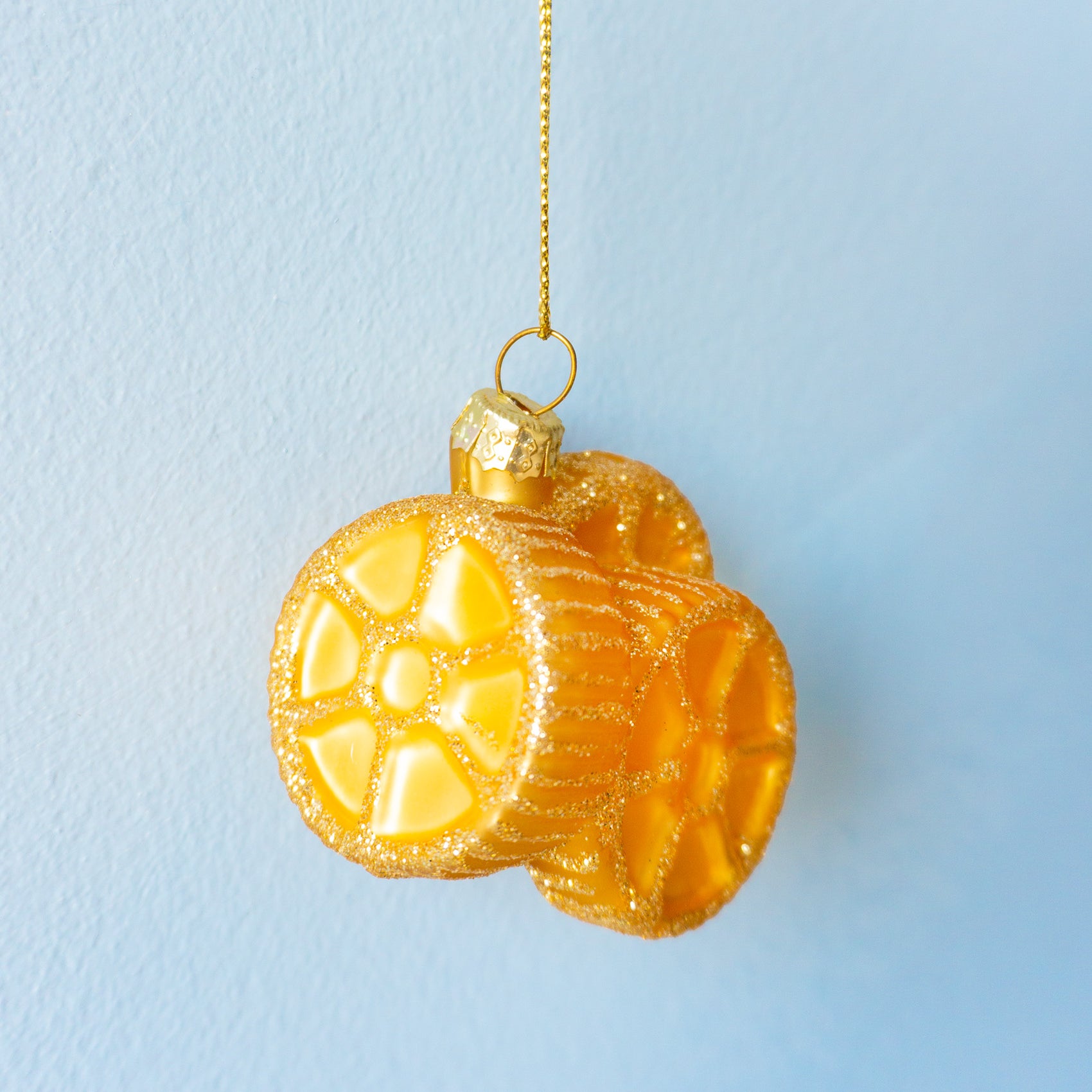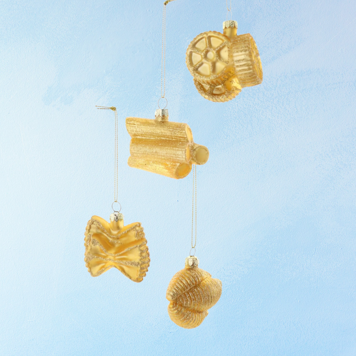 Assorted pasta shapes to add some whimsy to your holiday décor this season. Each ornament is made of glass, with glitter detail throughout. Ornament comes with string attached for hanging.