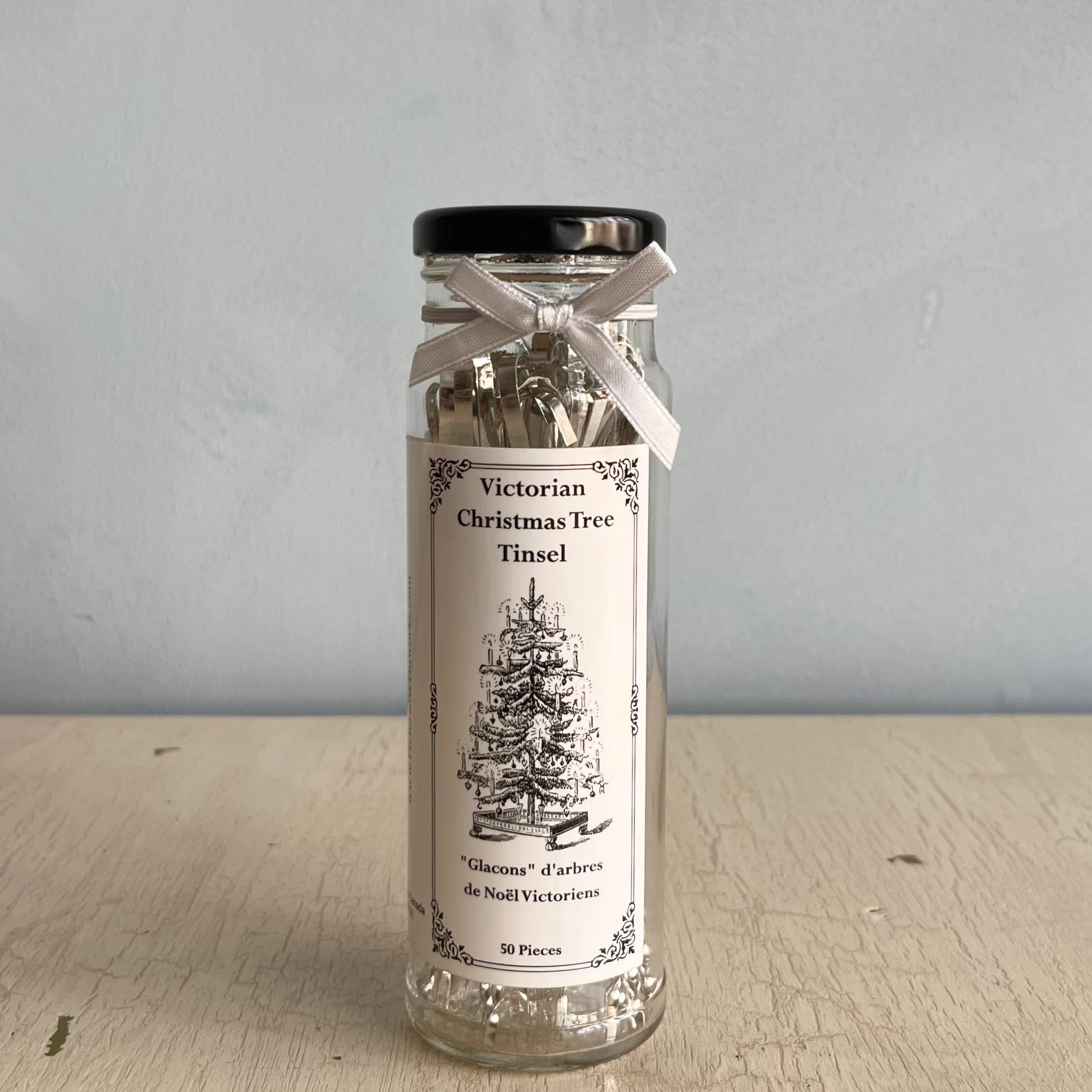This timeless decoration adds a finishing touch to any tree. Each tube contains 50 pieces of five-and-a-half-inch long Victorian-style tinsel. Crafted from USA-made tin-plated steel at a small shop in Lancaster, Ontario, Canada. Designed to last for decades.
