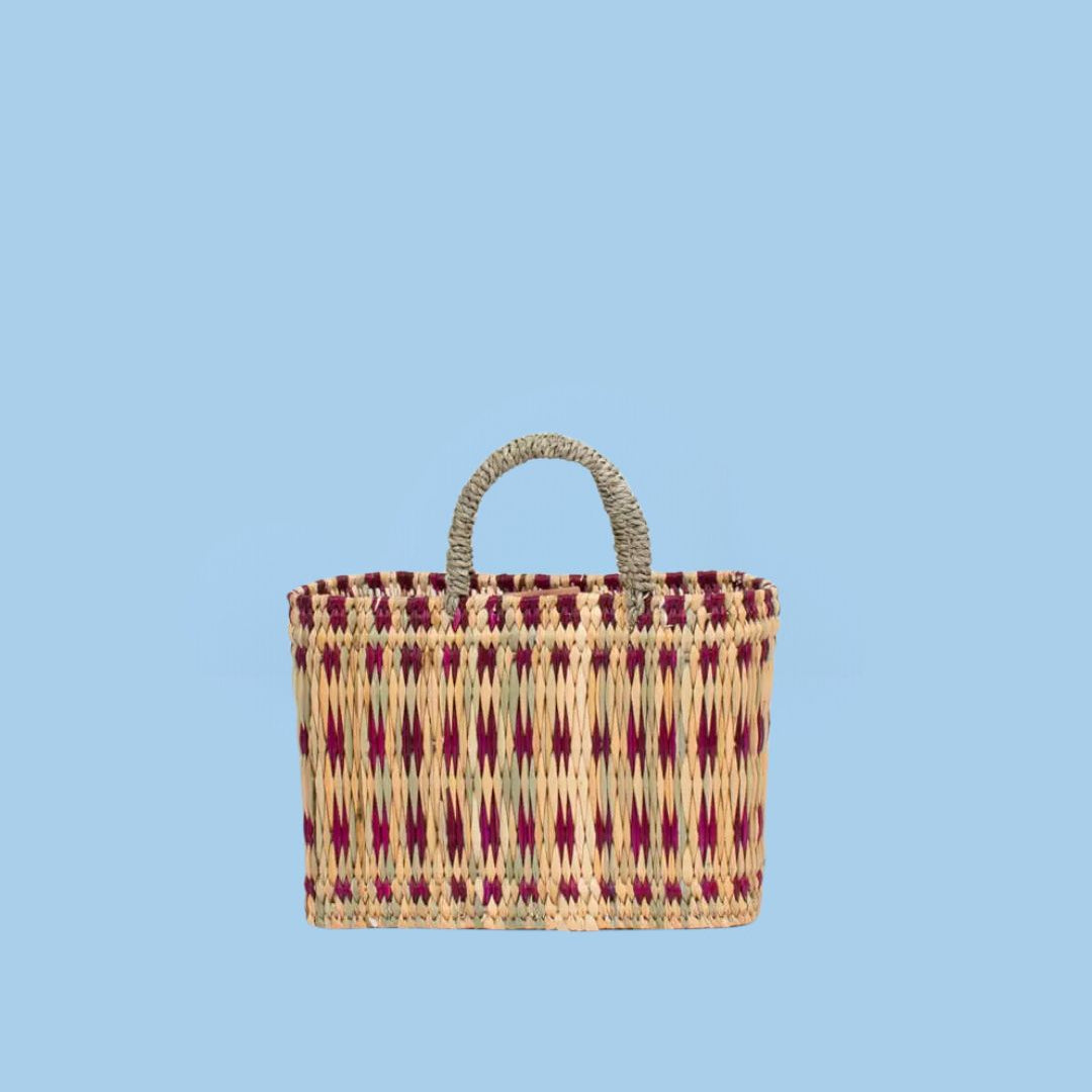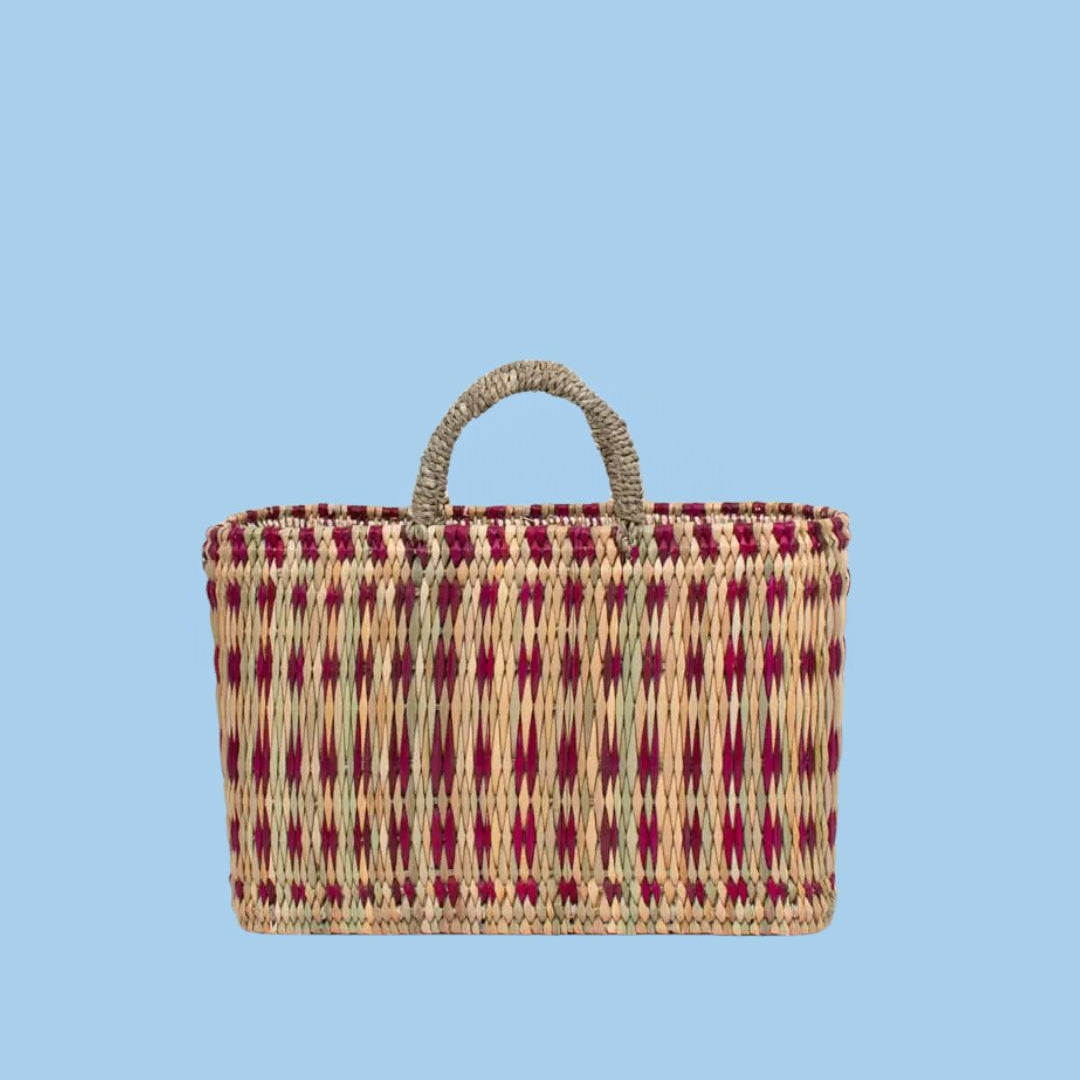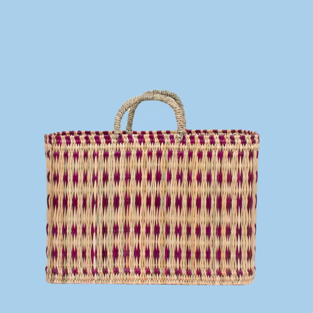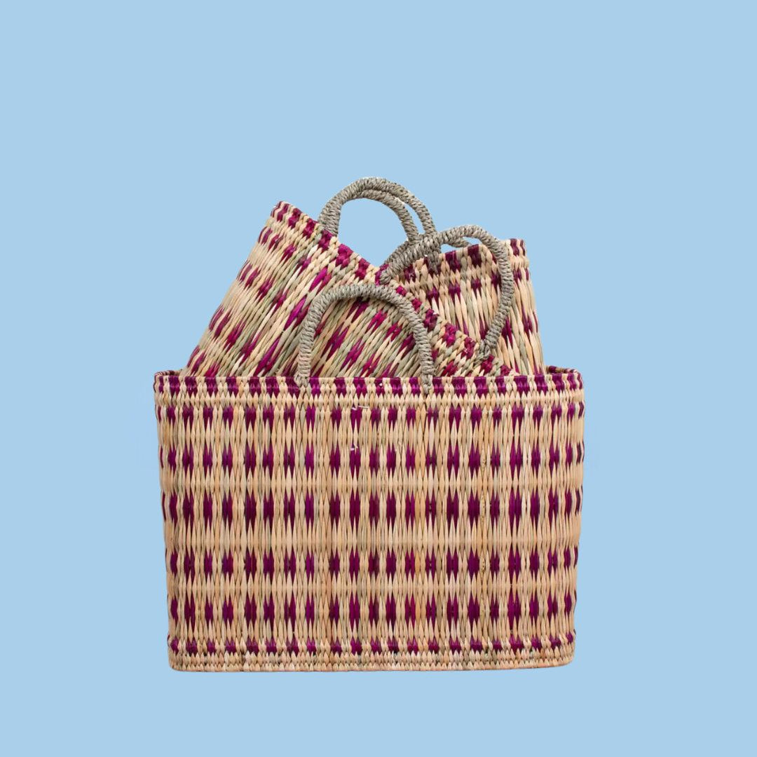 Beautiful reed baskets with a hand-dyed violet pattern through the weave. Crafted by hand in Morocco, these rectangular baskets make beautiful shoppers or storage baskets around the home. Ideal for market shopping, beach days, picnics, weekend trips and vacations.