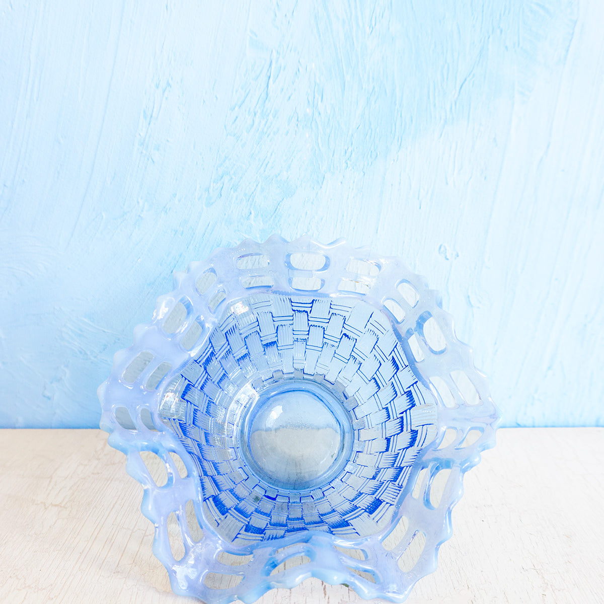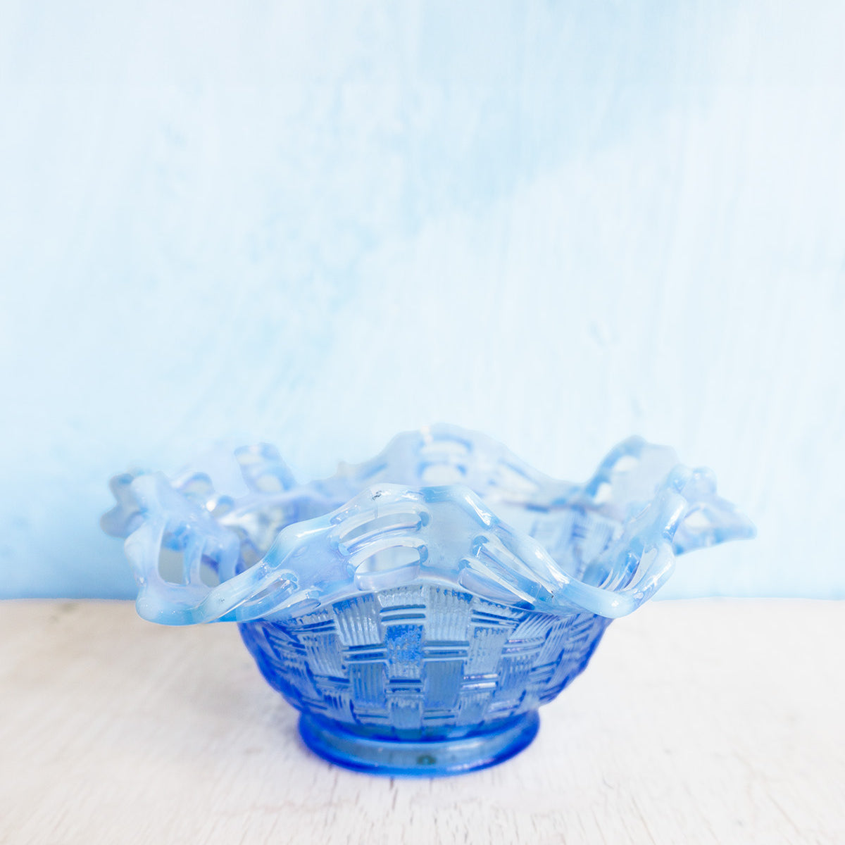 The Fenton Glass Jade Vase is a stunning piece of opaline glass from the late 20th century, featuring a basket weave design with a ruffled pattern.