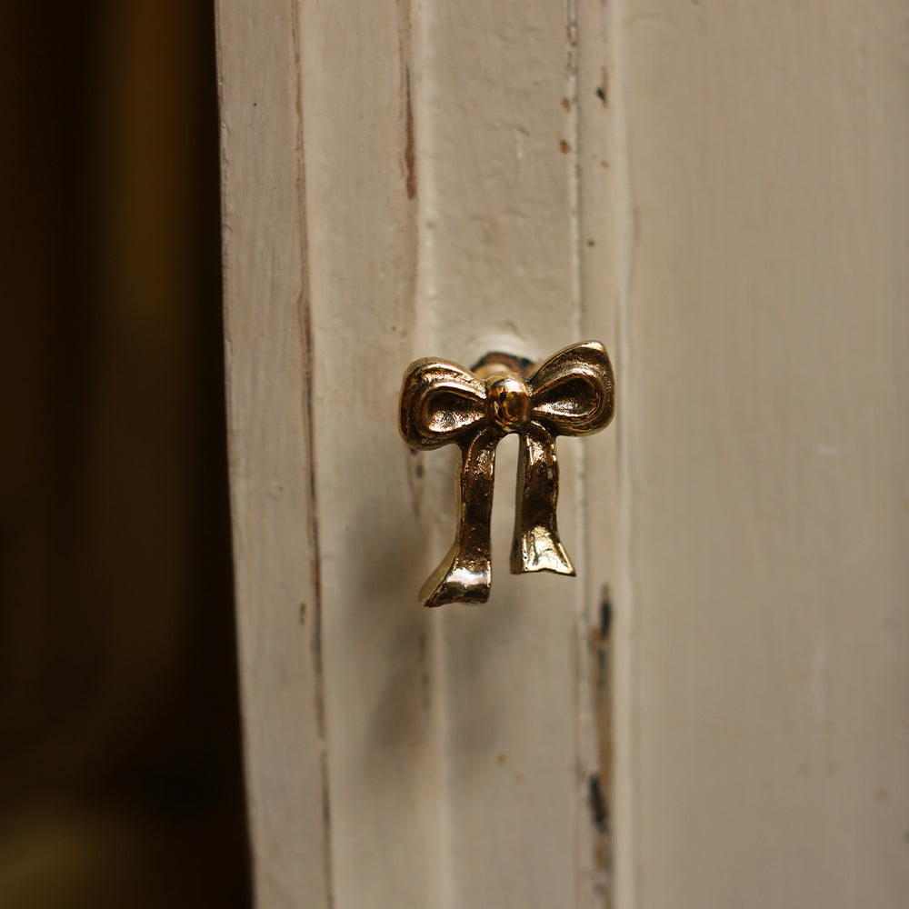 Handcrafted by skilled artisans from recycled brass, these furniture knobs feature a sweet bow design.