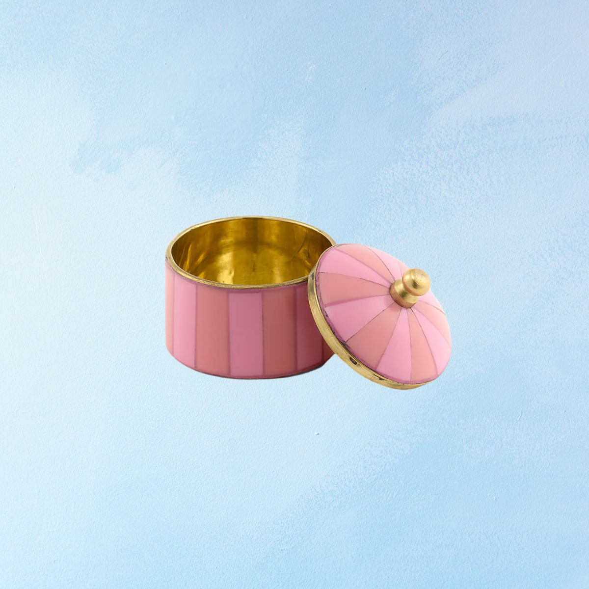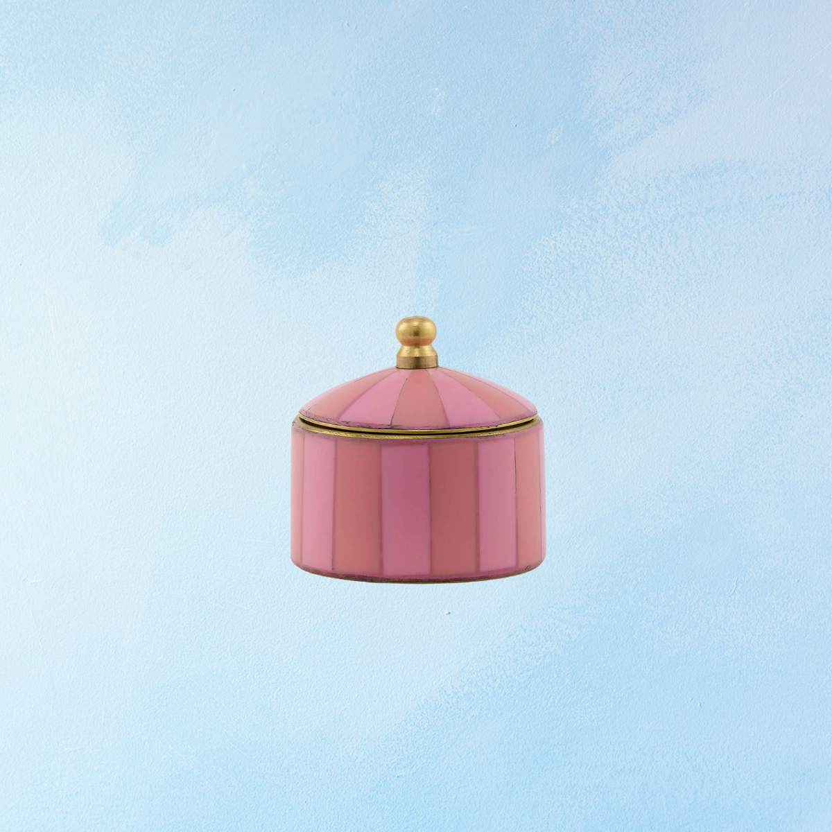 Adorable little circus box to keep your trinkets and treasures safe. Featuring a delightful pink striped pattern accented with golden brass details, this piece is both decorative and practical.