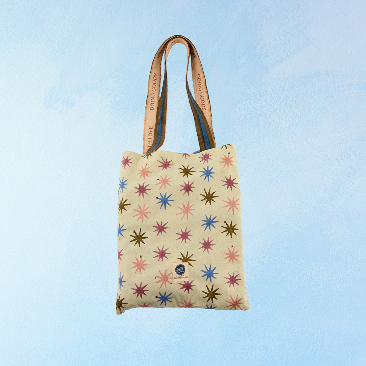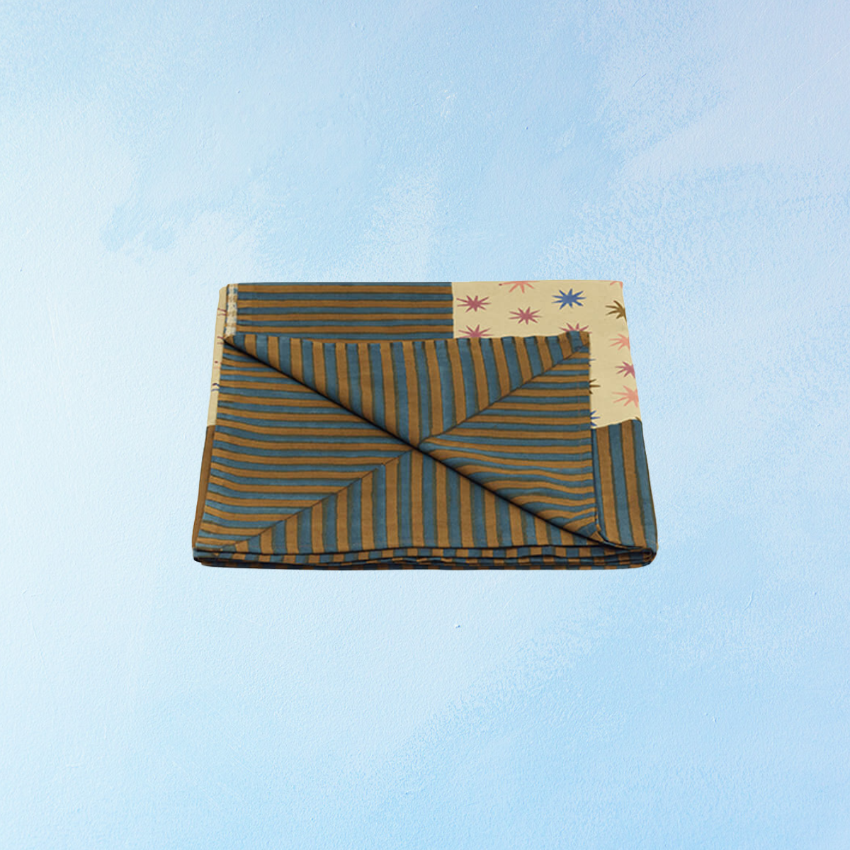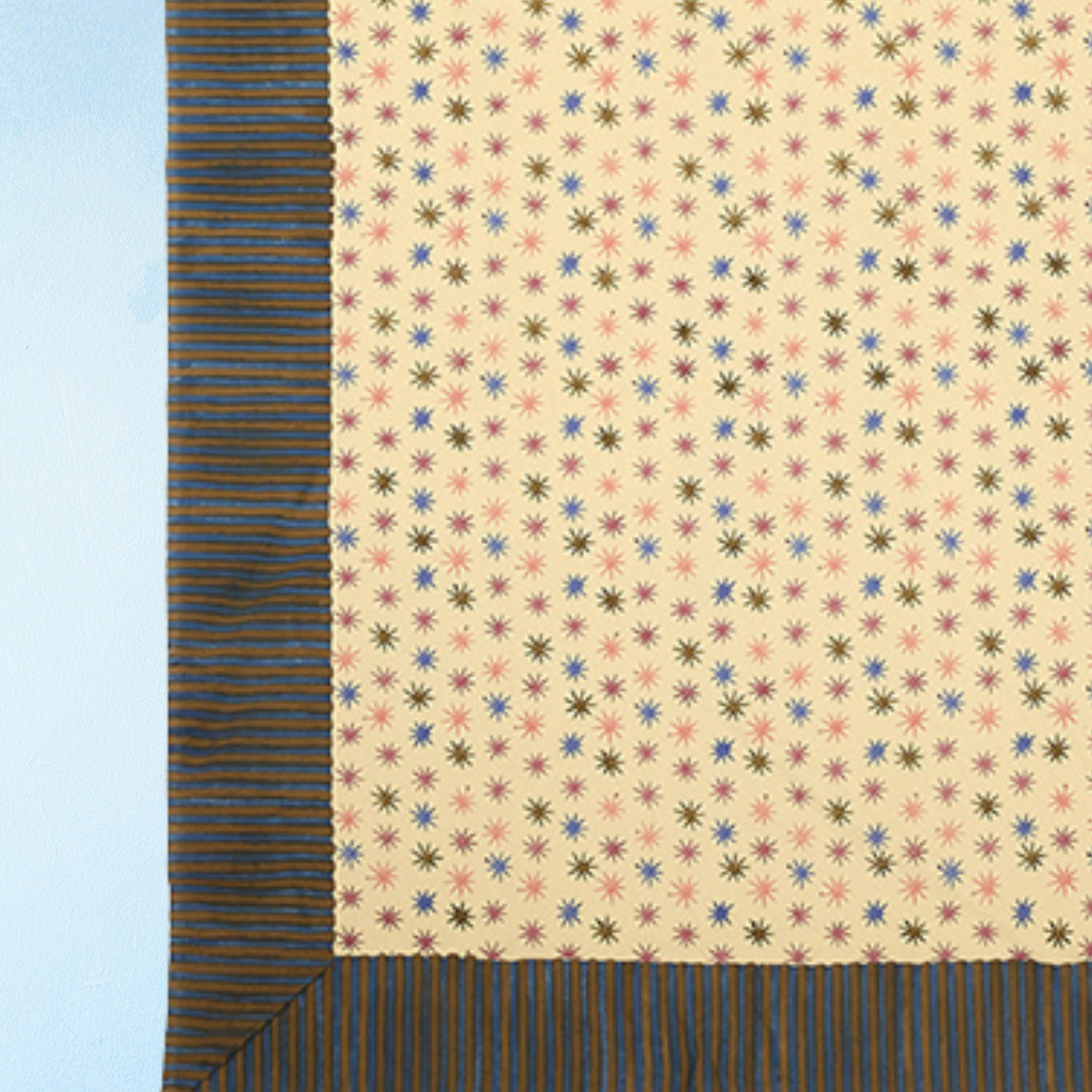 Features a playful pattern of colourful stars on a warm beige background, accented with bold stripes for a striking contrast. Hand block-printed by our skilled craftsmen in India using wooden blocks on 100% cotton, each piece is unique.