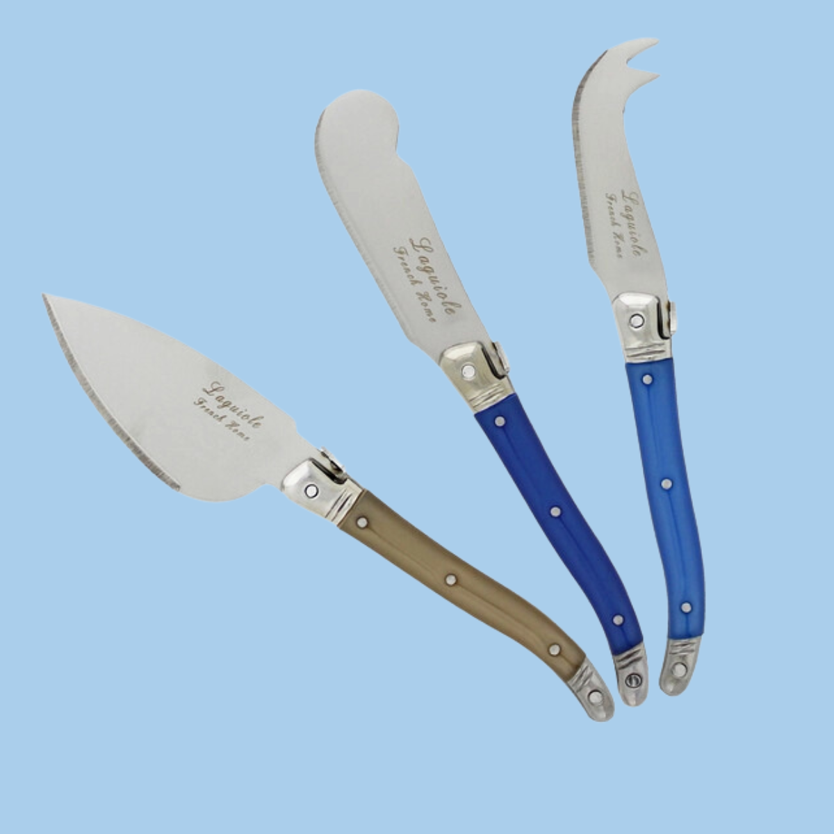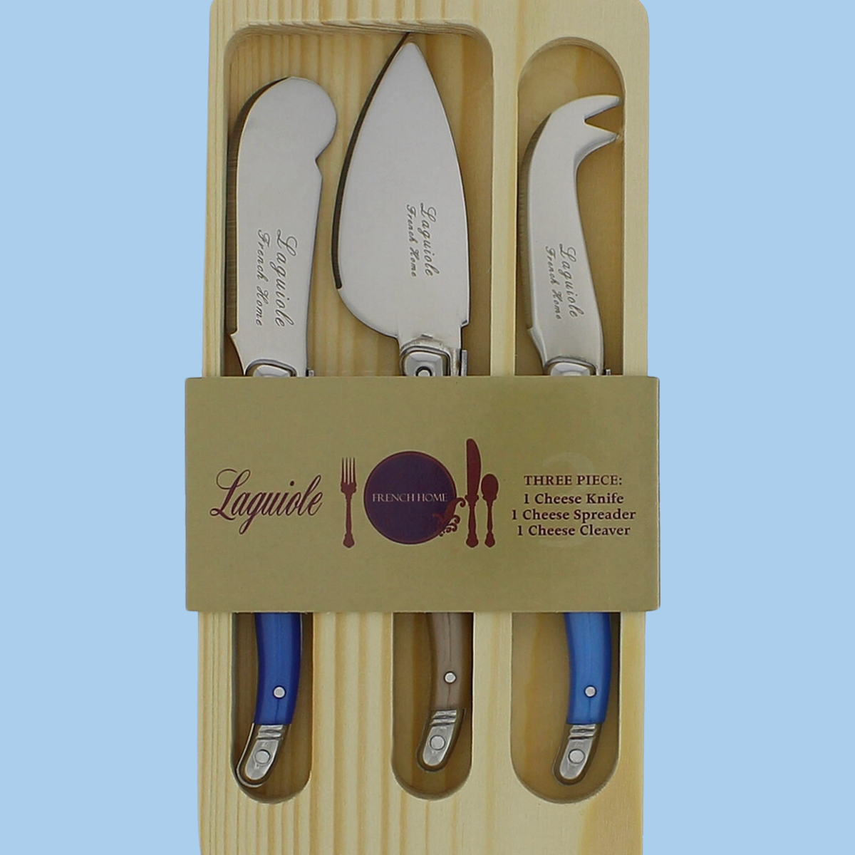 Elevate your entertaining style with this beautiful set of three stainless-steel cheese knives featuring cream and blue handles. This set includes a cheese spade, pronged cheese knife, and soft cheese spreader, perfect for serving both hard and soft cheeses. Add a touch of French elegance to your cheese platter with these stunning knives.