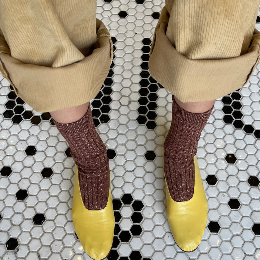 A little sparkle goes a long way with Her Lurex Socks. The glittery version of the OG Her Socks adds a special element to any outfit. Crafted from a cotton-modal blend, they feature sparkly flecks woven throughout, allowing them to glimmer in the light. Classic ribbed details, quarter-crew length, and shimmery elements make them perfect for days when you need some extra pizazz!