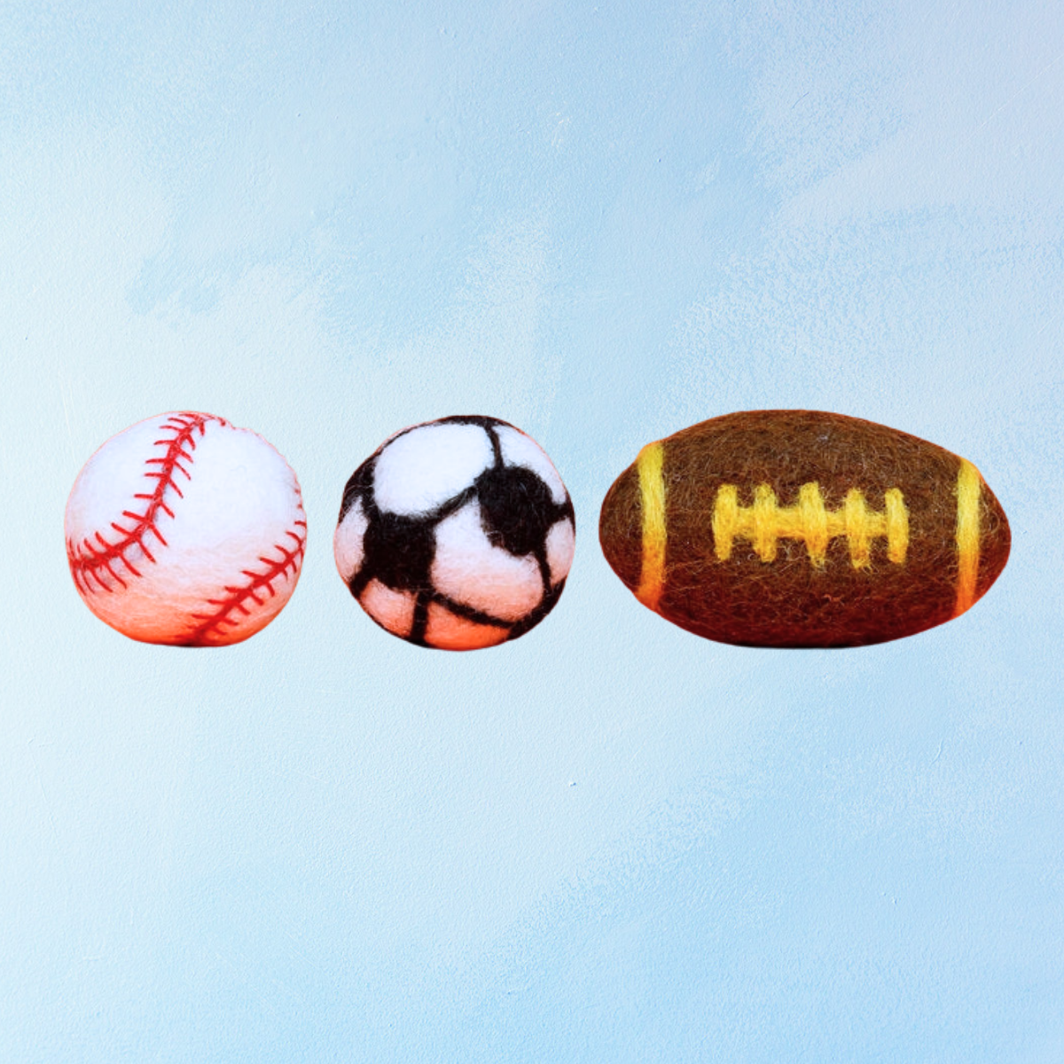Each set contains a baseball, a soccer ball, and a football.