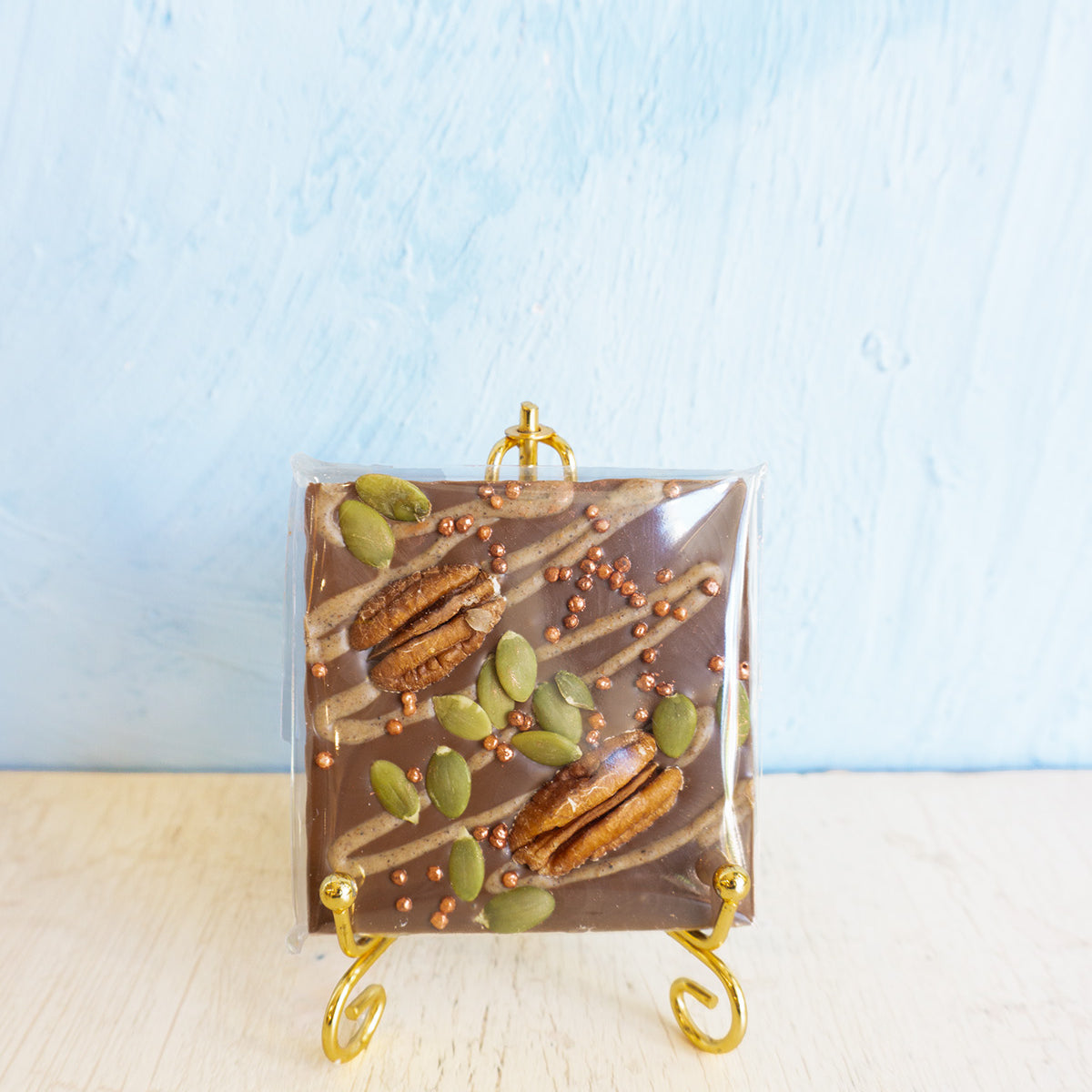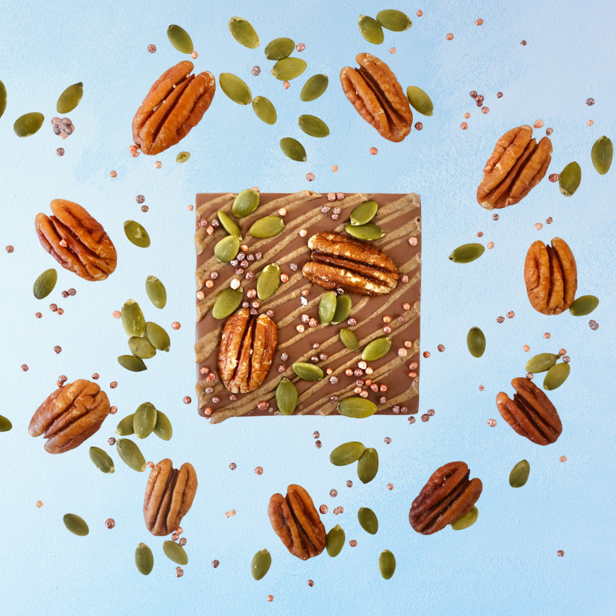 A rich 34% Belgian milk chocolate bar topped with a Pumpkin Spice white chocolate drizzle, Pumpkin Seeds, Pecans and Mini Crisp Pearls.