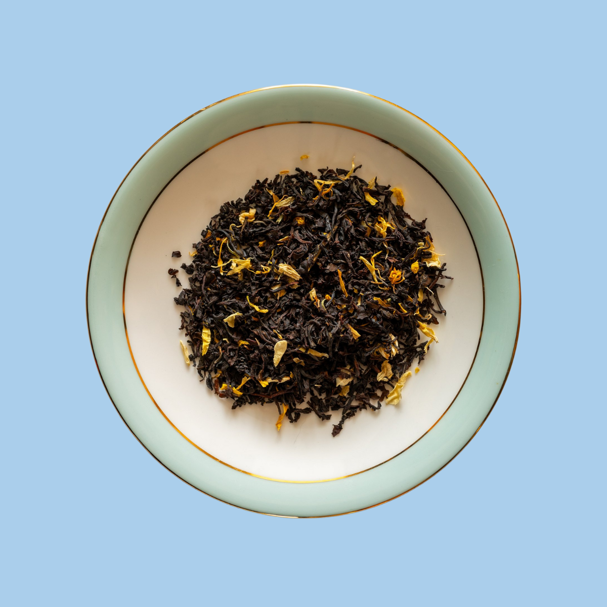 Contains black, tea, sunflower petals, natural flavours, marigold petals, calendula petals.