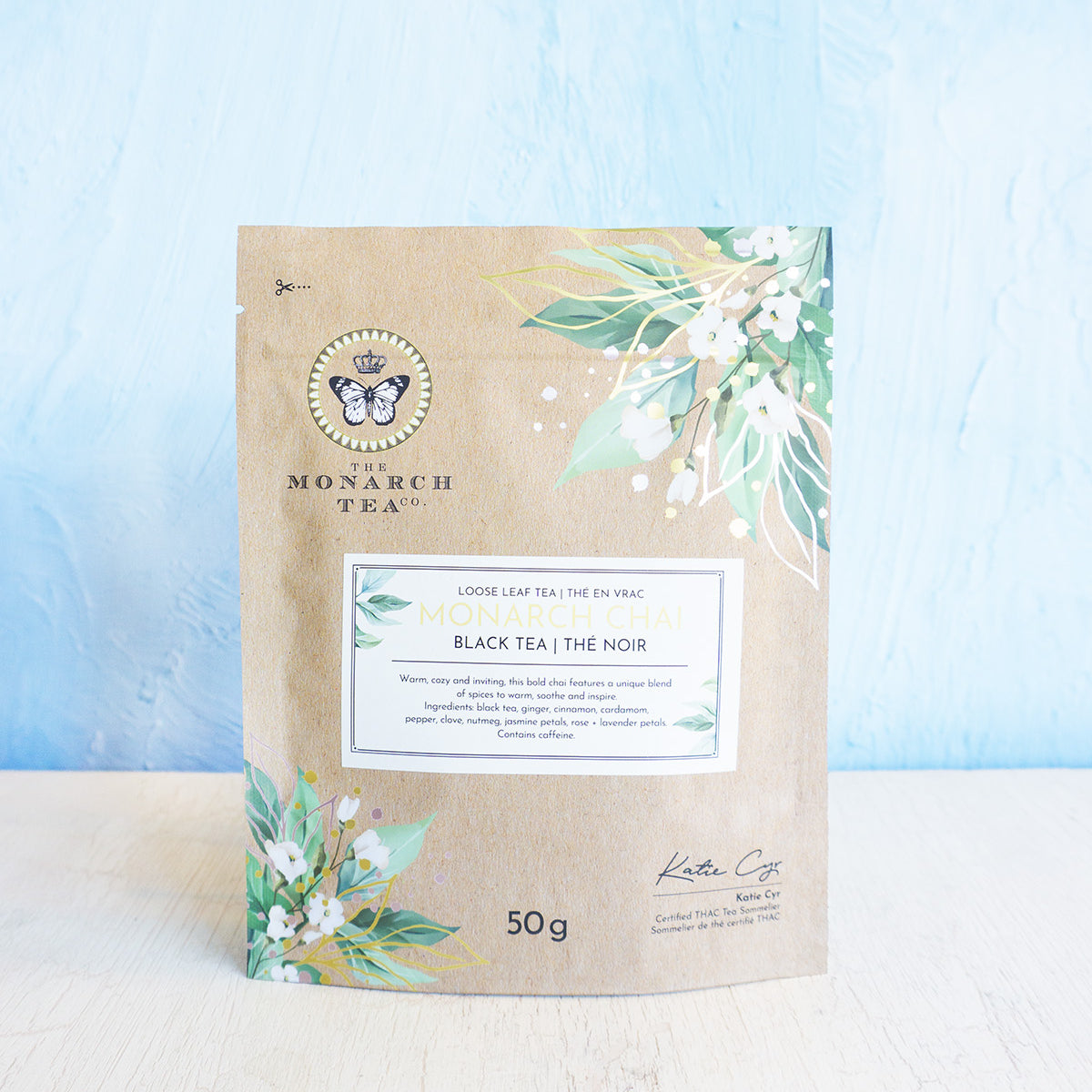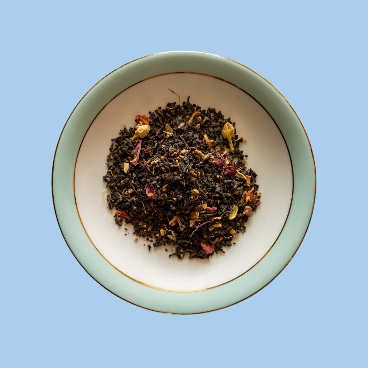 Contains black tea, ginger, cinnamon, cardamom, black pepper, white pepper, clove, nutmeg, jasmine petals, rose + lavender petals.