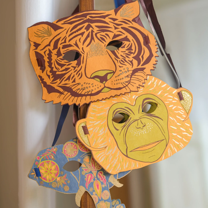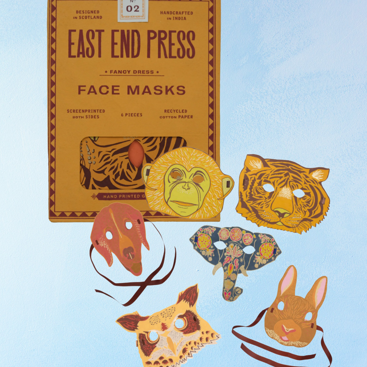 Costume masks, screen printed on both sides on thick, handmade cotton paper. The recycled paper masks have two cut-out eye holes with securely attached ribbon on either end, making them ideal accessories for parties.