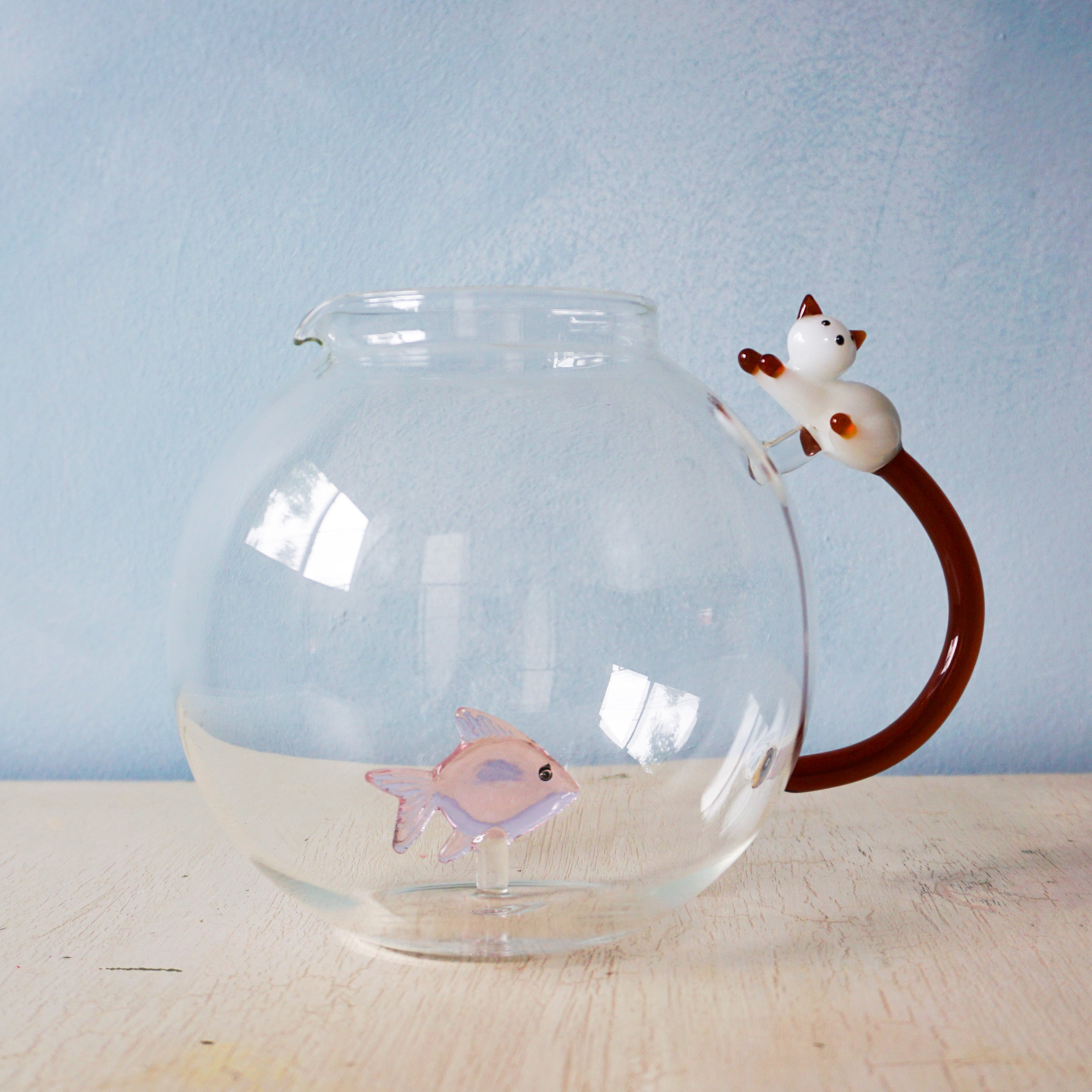 This beautiful glass pitcher from Ichendorf Milano, featuring a motivated cat pursuing a pink fish, is both fun and functional.