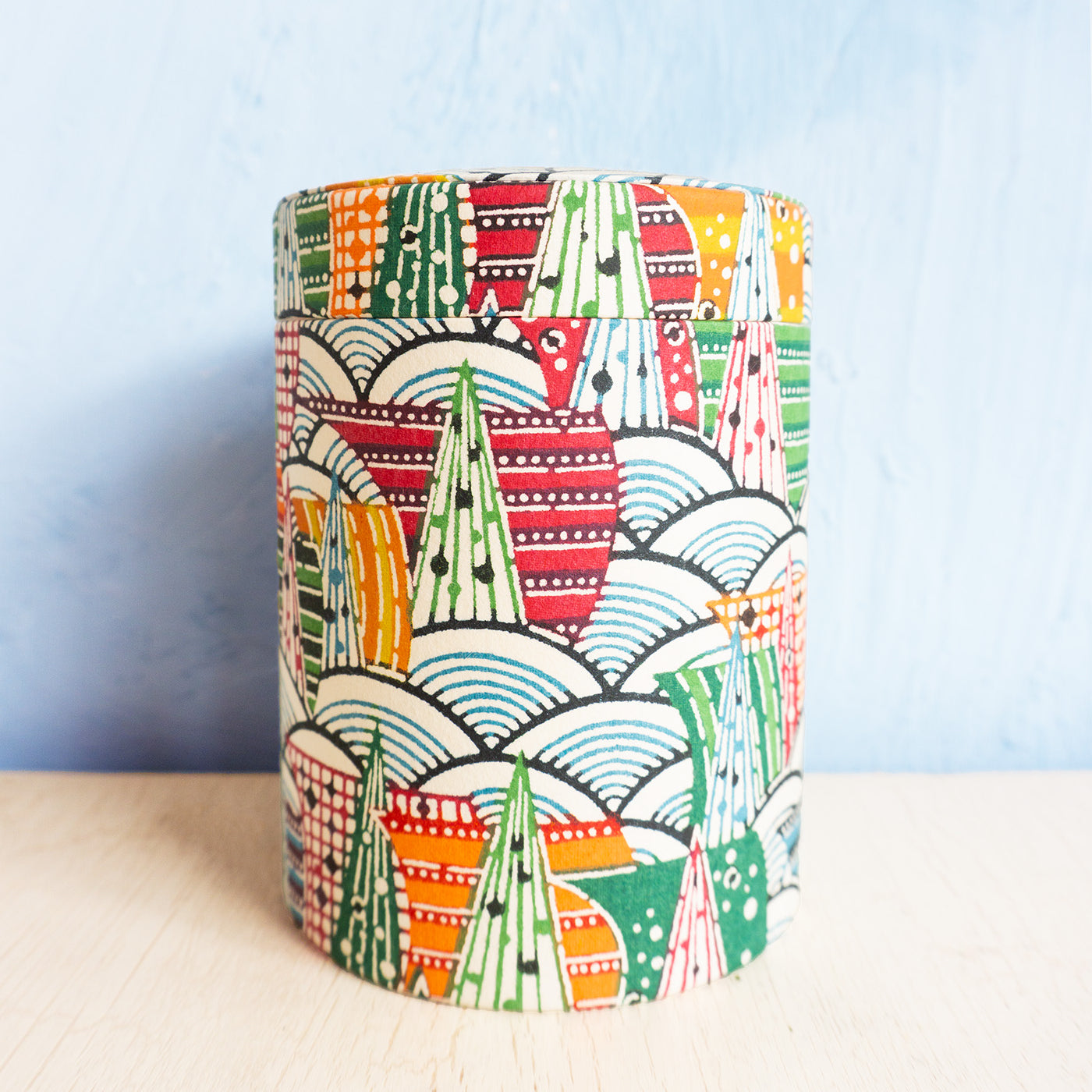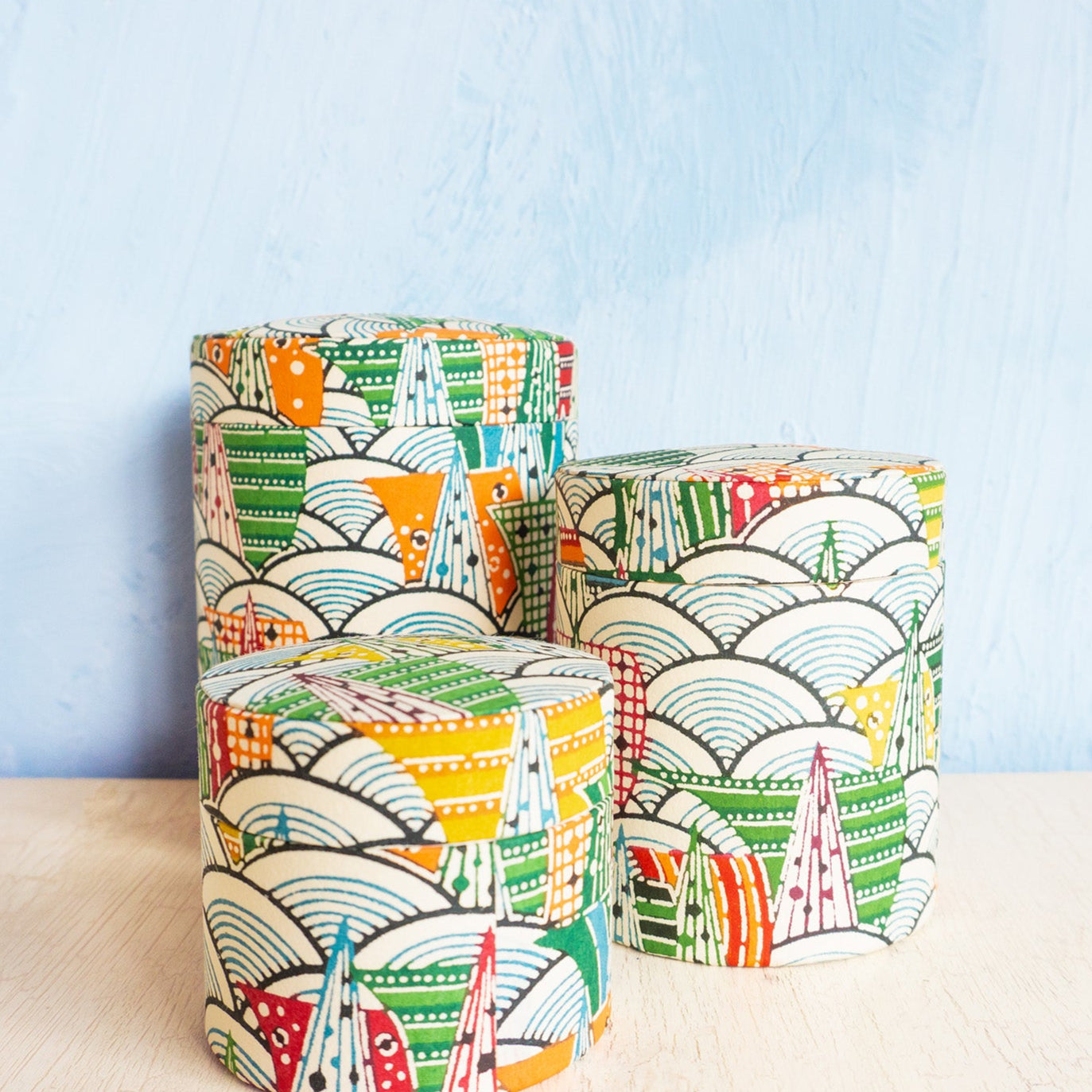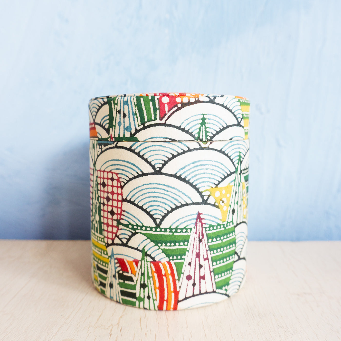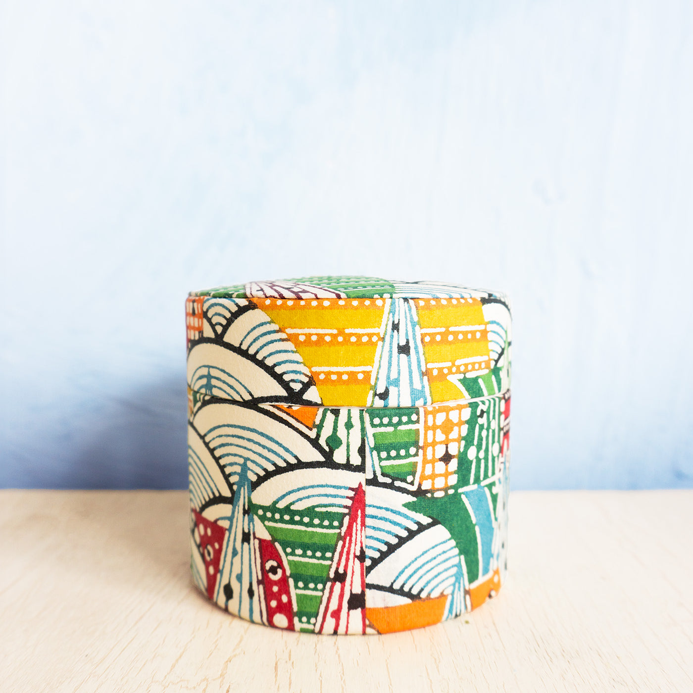 Adapting traditional patterns and motifs, this lovely cylindrical box has a slight waterproof coating to it, making it a beautiful and useful place to store delicate items. Can be used in bathrooms and kitchens without risk of serious water damage.