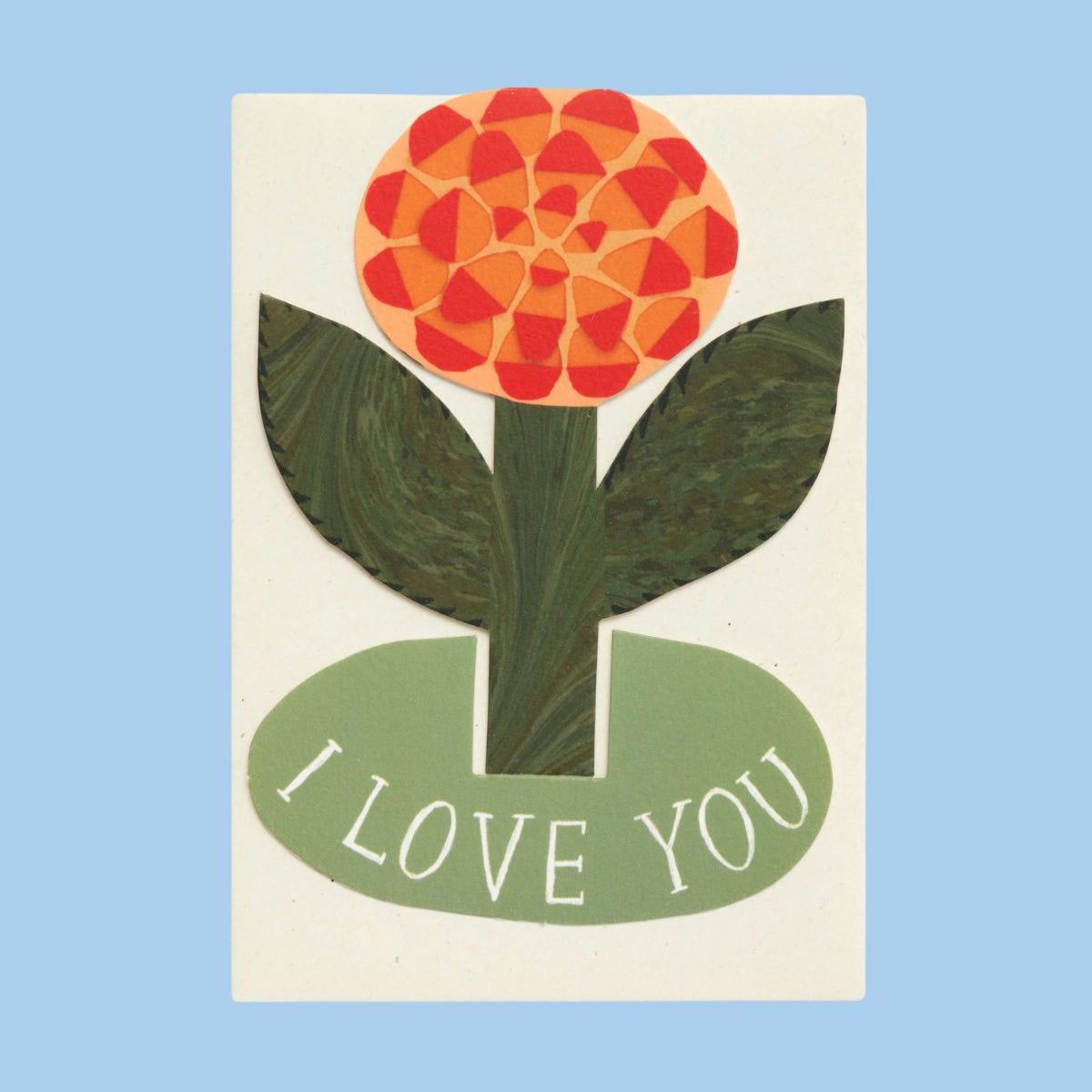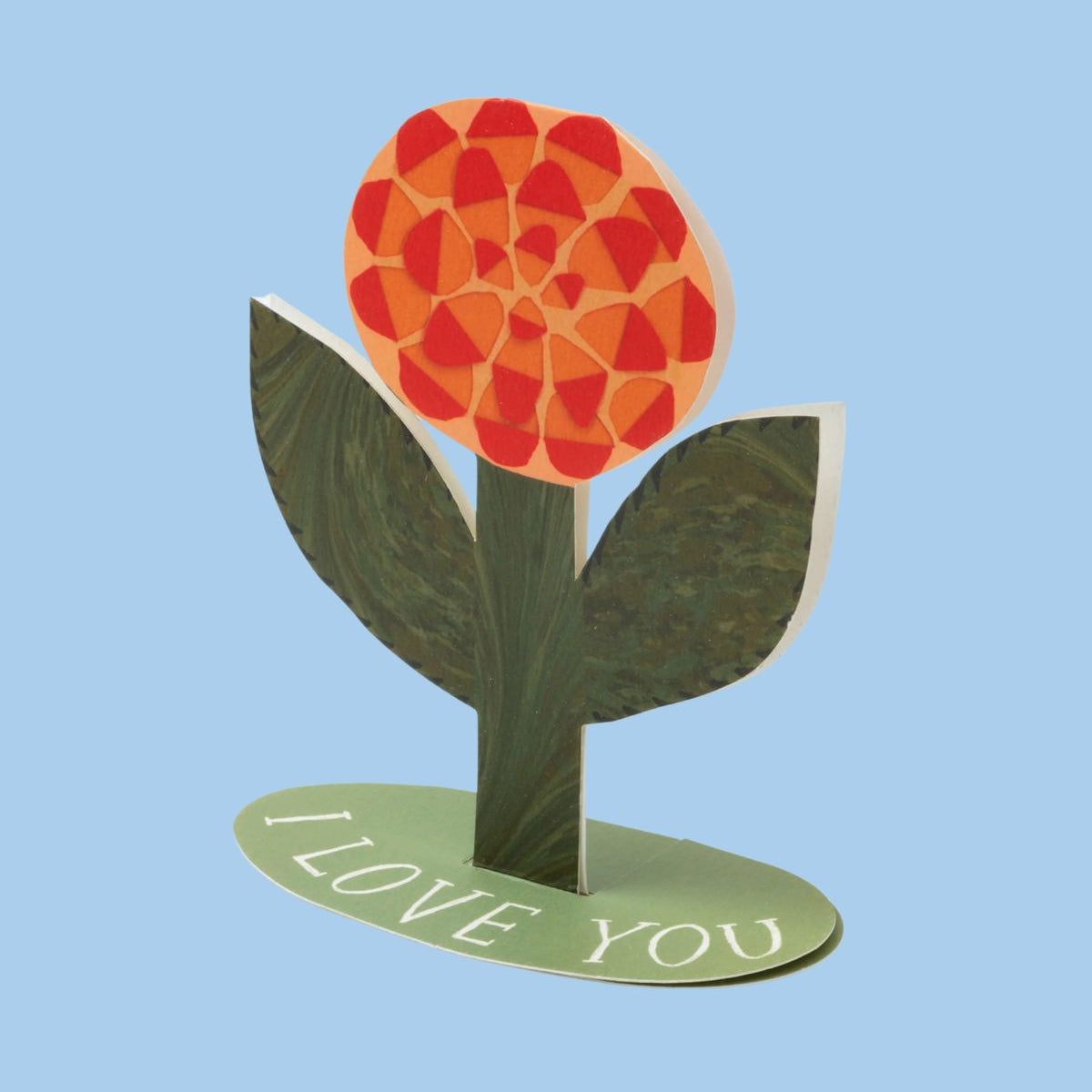 A bright red rose tells someone they are loved. This uniquely designed card remains standing when folded open and displays the message "I LOVE YOU" across the base.