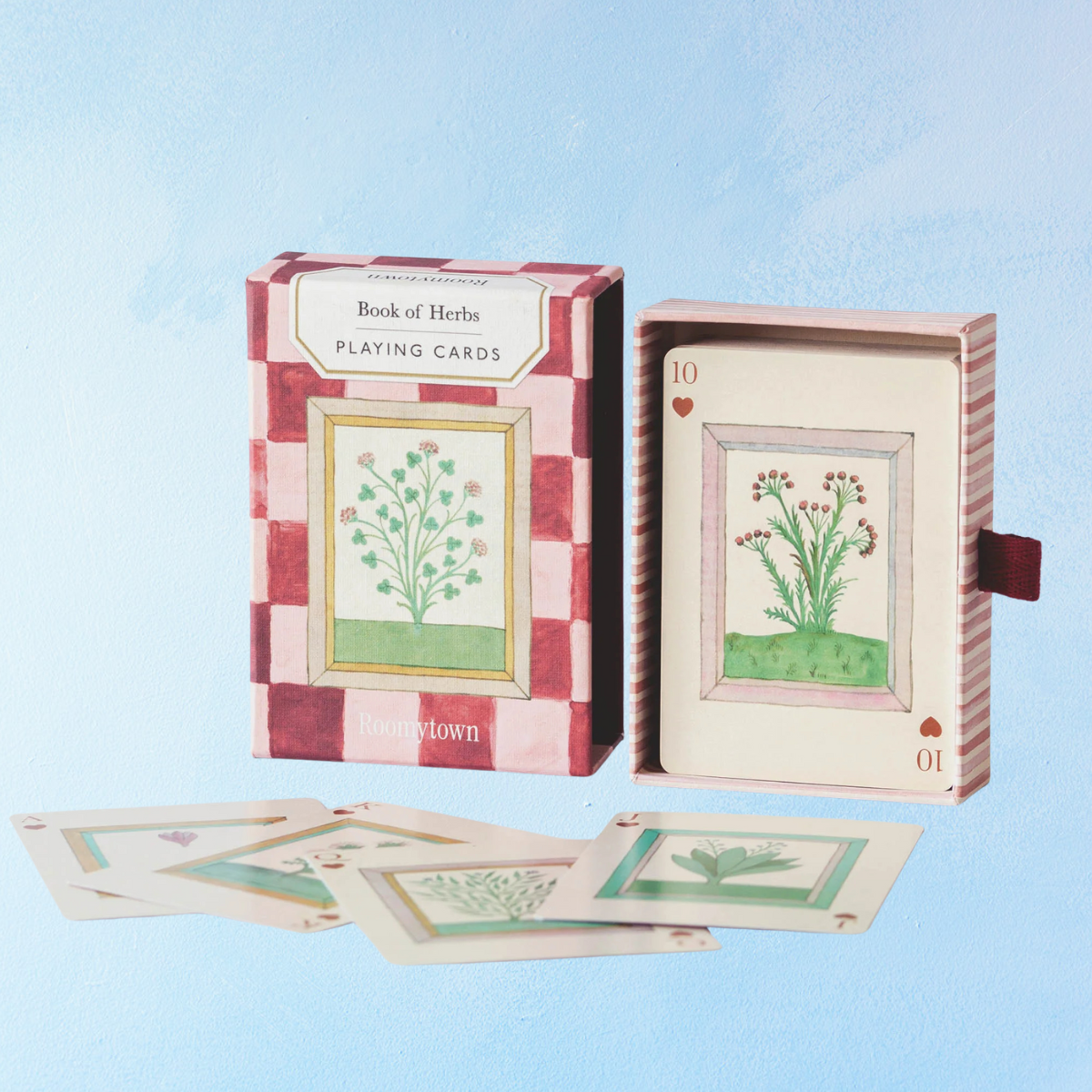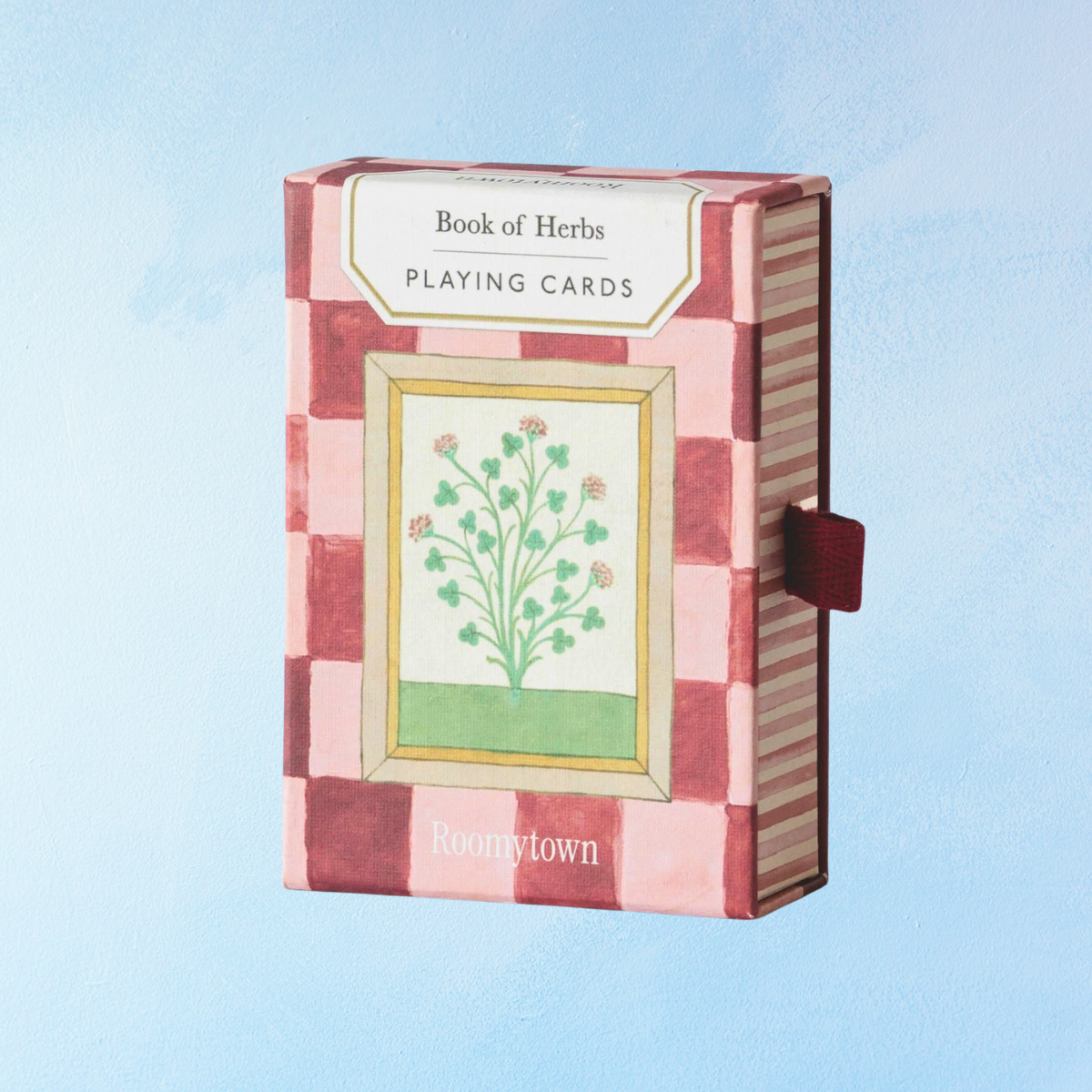 This Single Deck of 52 Playing Cards features enchanting herb illustrations, handpicked from a German Book of Herbs first published in 1462. The back of each card boasts a contemporary pink check pattern, painted in delicate watercolour, blending history with modern design.
