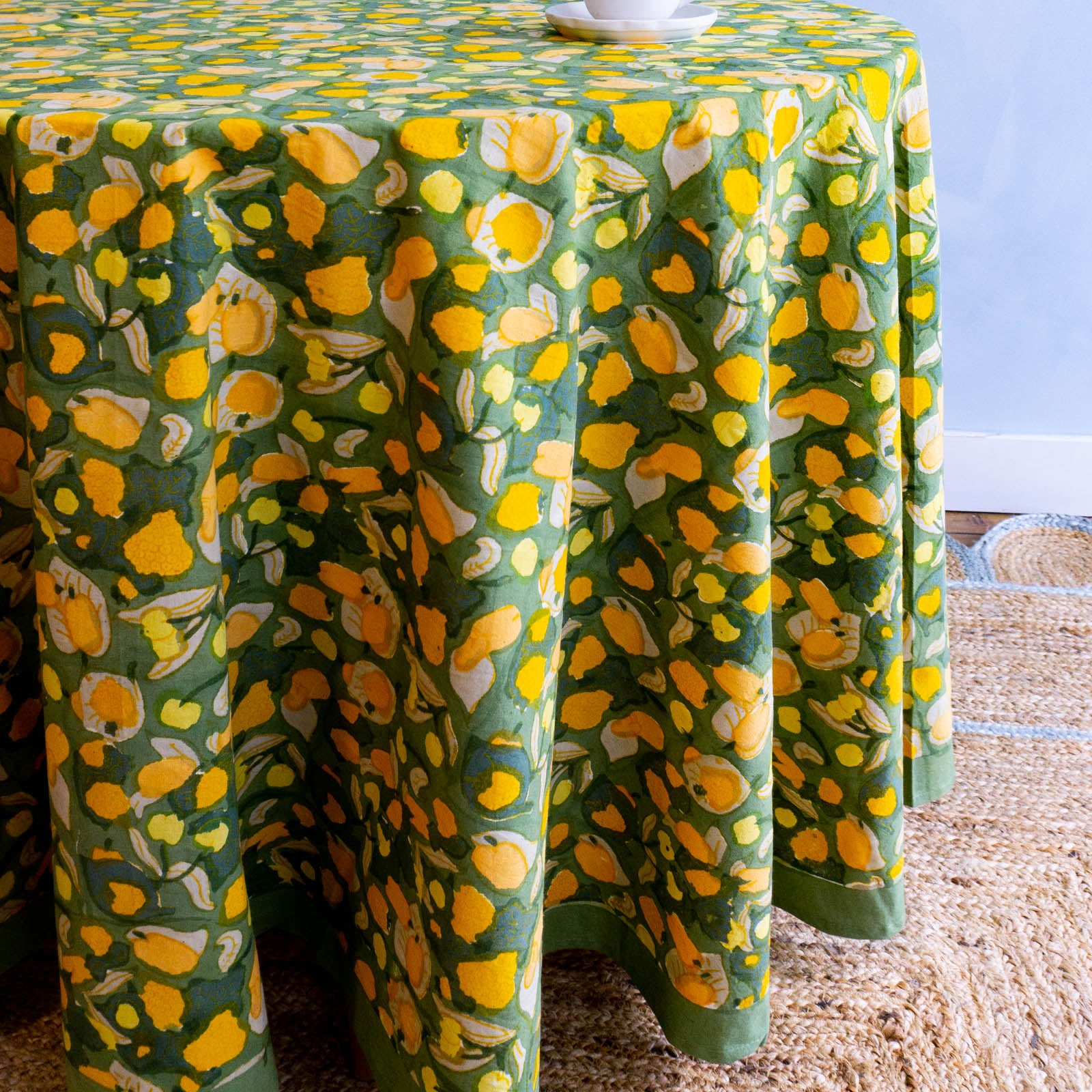 This French linen tablecloth has been carefully handprinted by skilled artisans using a time-honoured technique, resulting in a singular piece of craftsmanship.