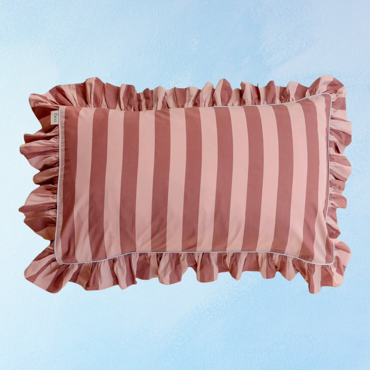 Revive your bedscape with a pair of pink & burgundy pillowcases featuring a stripe pattern and whimsical ruffled edge. The poplin cotton is skin-friendly and breathable, ensuring a peaceful night's sleep. Best paired with cosy evenings and slow mornings. Dust bag included for easy storage. Mix or match with our collection of duvet covers.