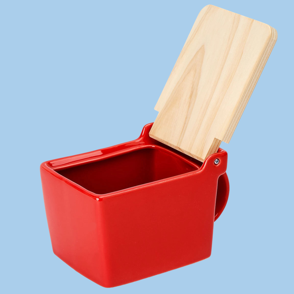 Store your salt close at hand with this ceramic salt cellar box. The hinoki wood lid keeps salt protected from moisture and debris. Designed with a flip lid which simplifies opening and refilling while the handle makes maneuvering around the kitchen a breeze. Holds up to 2 cups of salt!