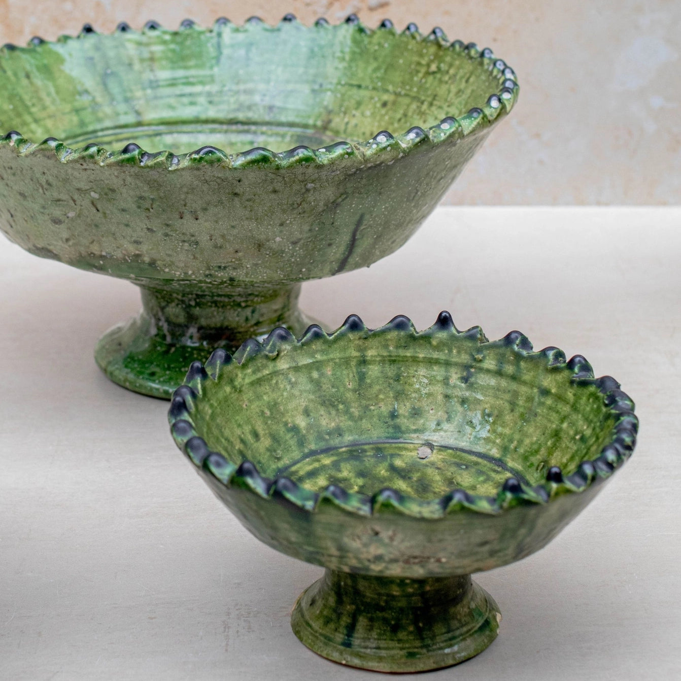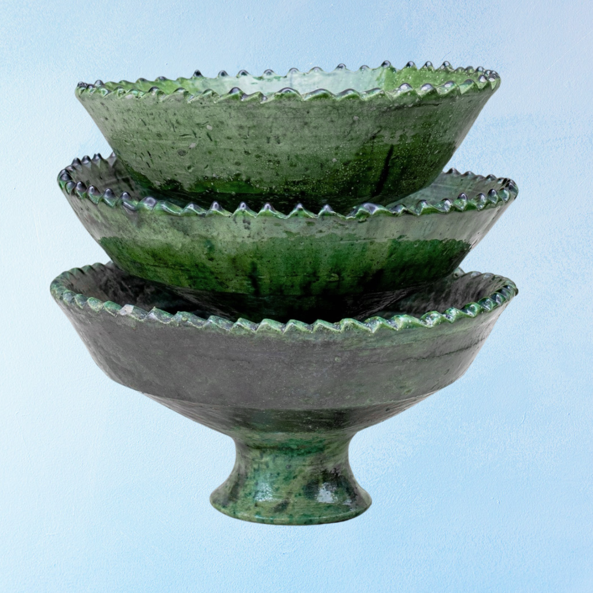 These handcrafted ceramic bowls exudes Moroccan charm with their unique jagged edge design and captivating waterfall green glaze. Perfect for housing towering delights like fruit, table service, or showcasing collections of objects.