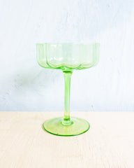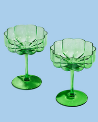 Perfect for your next brunch or dinner party, these flirtatious champagne and cocktail coupe-style glasses feature a beautiful green flower design that adds a wonderful, maximal touch to any table setting.
