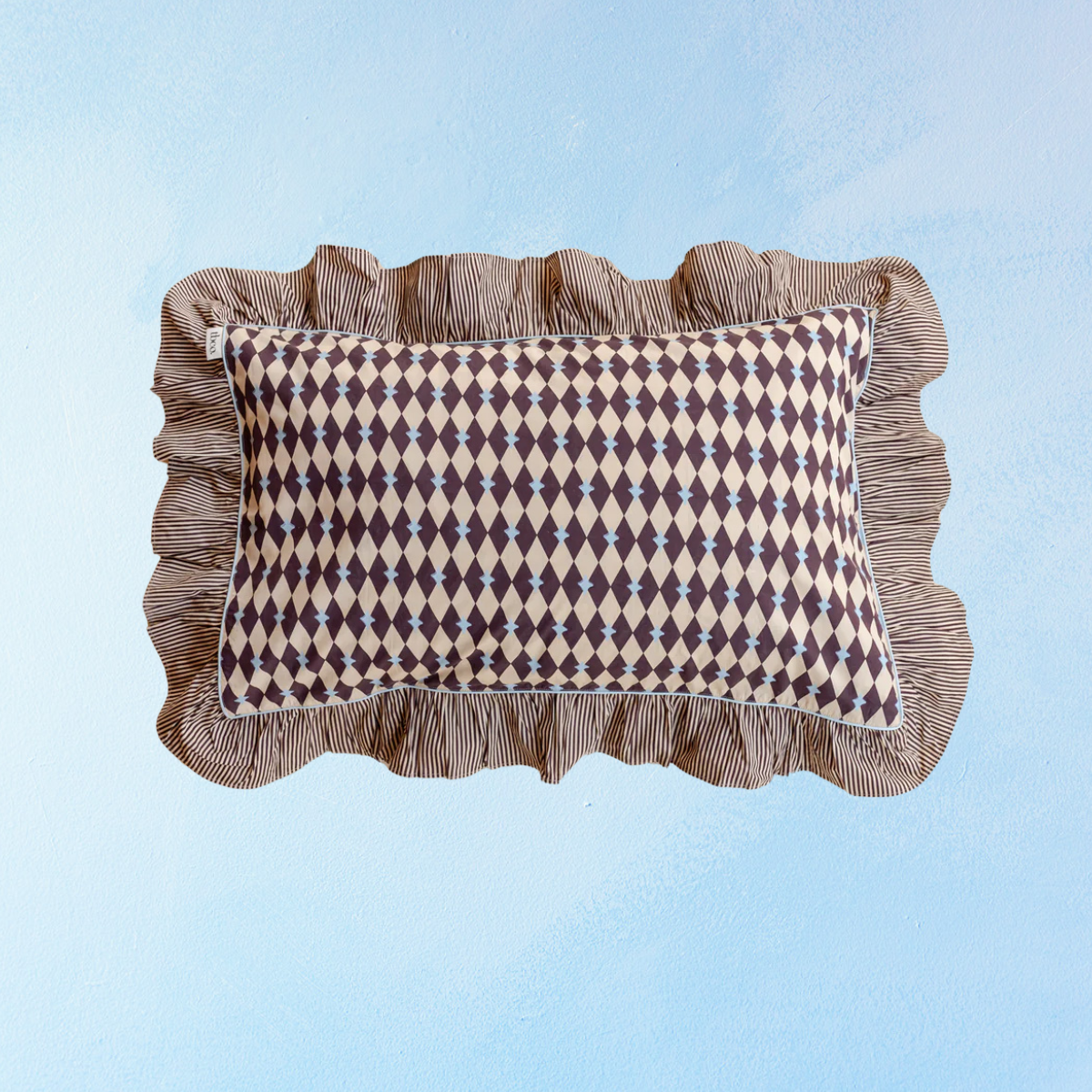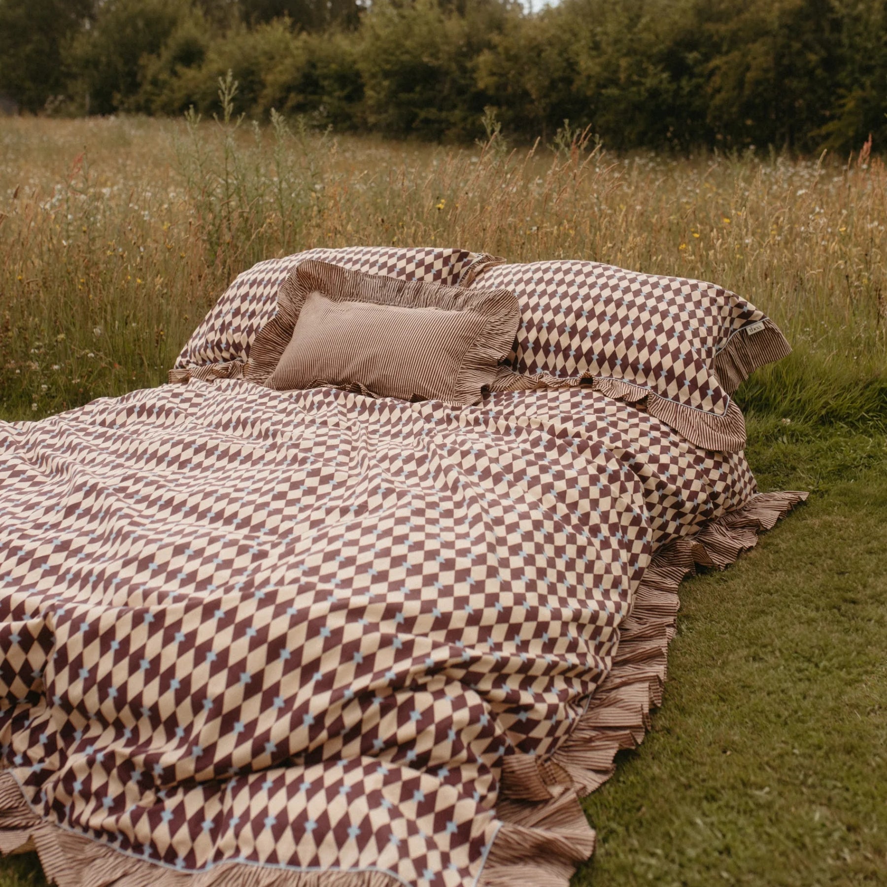 Woven in crisp 100% cotton poplin and finished with a delicate ruffled edge, this pair of pillowcases in a playful camel and burgundy harlequin pattern is soft and breathable for a comfortable night's sleep. The reversible design with harlequin pattern on the front and contrasting stripes on the back offers endless styling possibilities.