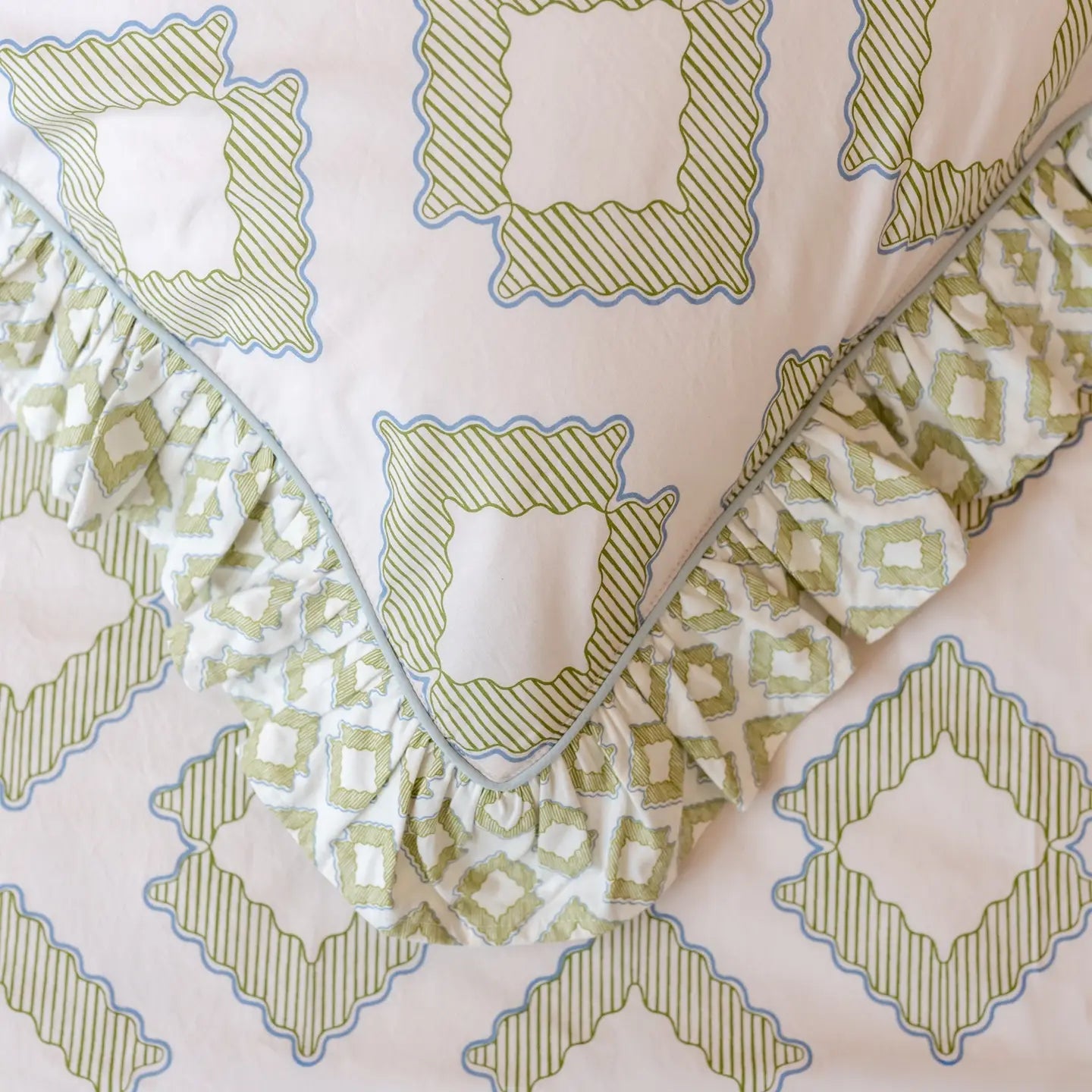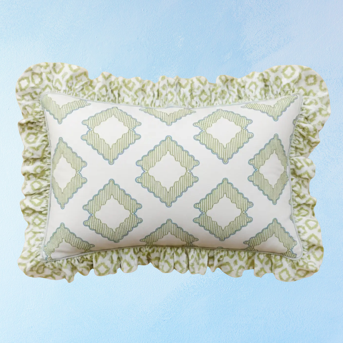 Redonnez vie à votre chambre avec une paire de taies d'oreiller vertes ornées d'un motif de losanges verts doux et d'un bord à volants. Le coton est doux pour la peau et respirant, assurant une nuit de sommeil paisible. Idéal pour les soirées douillettes et les matinées tranquilles. Housse de rangement incluse pour un rangement facile. À assortir ou dépareiller avec notre collection de housses de couette.