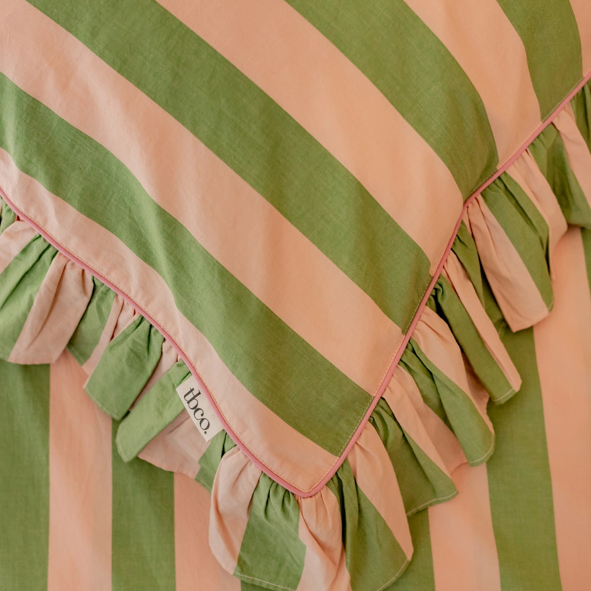 Redonnez vie à votre chambre à coucher avec une paire de taies d'oreiller vertes à rayures et à bord à volants. Le coton est doux pour la peau et respirant, assurant une nuit de sommeil paisible. À associer de préférence avec des soirées douillettes et des matinées tranquilles. Sac de rangement inclus pour un rangement facile. Mélangez ou assortissez avec notre collection de housses de couette.