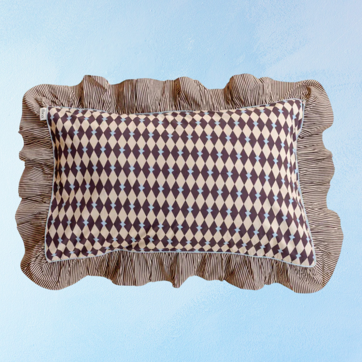 Woven in crisp 100% cotton poplin and finished with a delicate ruffled edge, this pair of pillowcases in a playful camel and burgundy harlequin pattern is soft and breathable for a comfortable night's sleep. The reversible design with harlequin pattern on the front and contrasting stripes on the back offers endless styling possibilities.