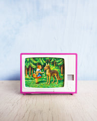 This '70s-inspired mini view master toy, sure to captivate children and adults alike. By pressing the small plastic button located on the bottom of the miniature television and peering through the lens at the back, one can marvel at the fairy tale of Little Red Riding Hood as it unfolds through a series of reels.