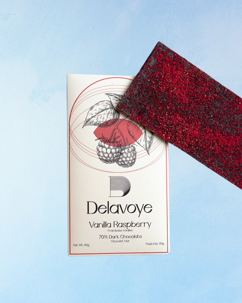 Carefully selected cacao beans and a dusting of vanilla sugar and raspberry powder make up the irresistible balance of sweet and tangy waiting to be discovered in this chocolate bar.