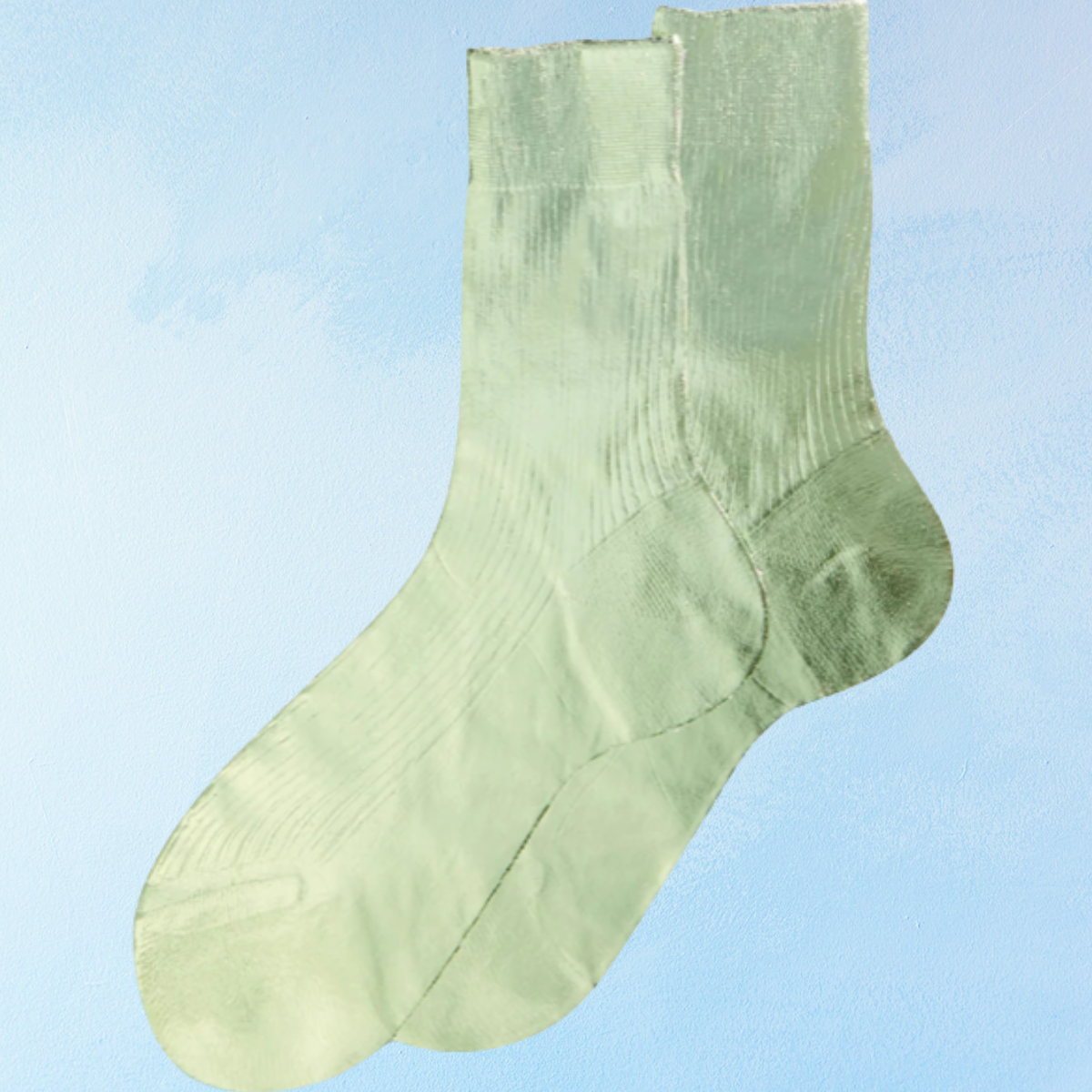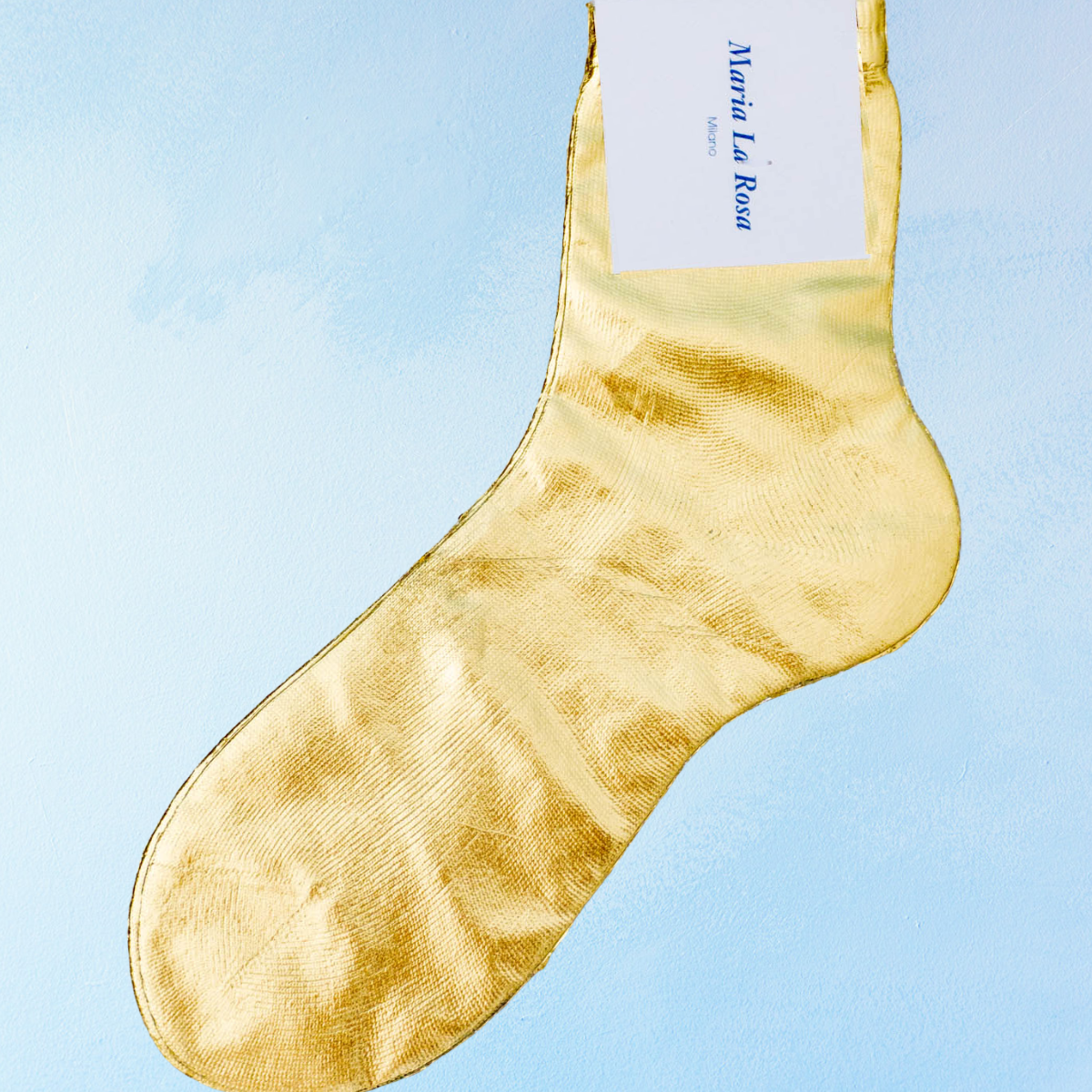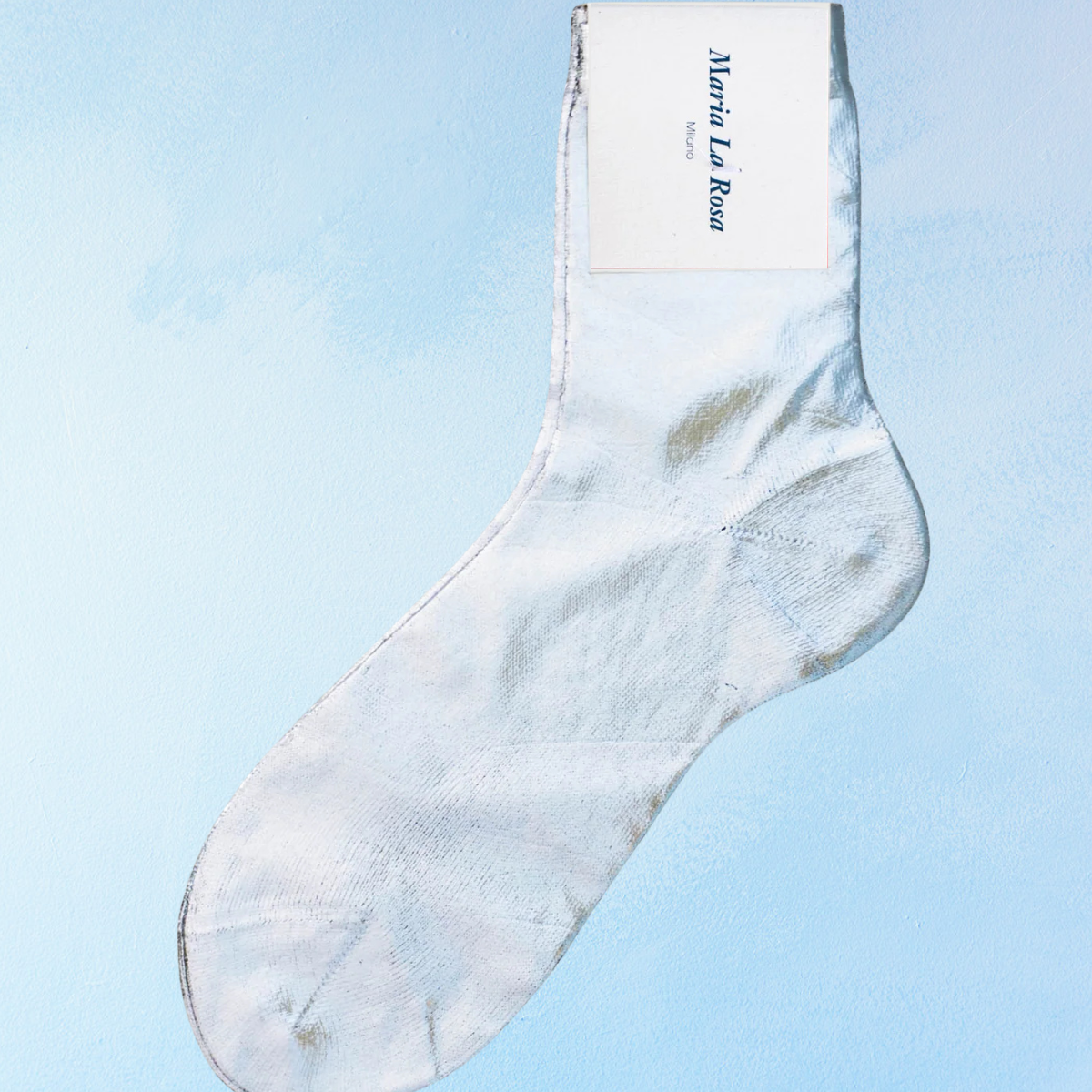 Women's laminated socks, made with precious silk yarn, ideal for all seasons. The material with which they are made, in fact, despite its thinness, is extraordinarily insulating, making it very cool in summer and warm in winter. The sock was subsequently covered with a metallic finish, which, after multiple washes, tends to disappear, letting the brilliance of the underlying silk emerge.